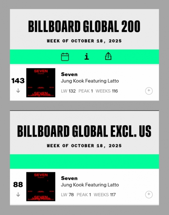 《Seven》以衡量全世界大众音乐趋势的代表性指标--Billboard主单曲排行榜“Hot 100”的第一名成绩入榜,之后15周在榜。在与Billboard的两大山脉“UK Official”主单曲排行榜“TOP100”中,以第三位入榜后,作为K-POP Solo歌手歌曲首次停留了14周,取得了惊人的成果。