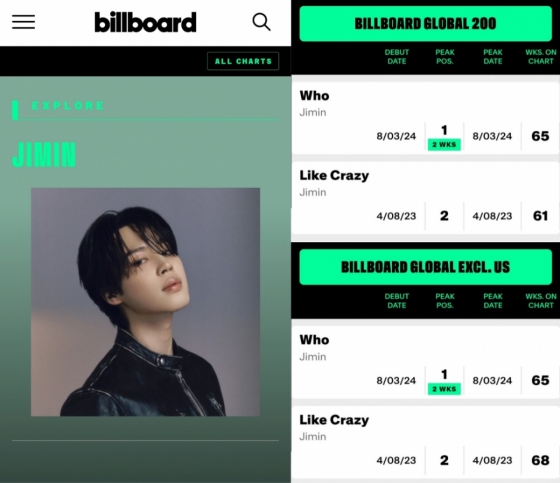 在Billboard“World Albums”榜单中,Jimin的第二张个人专辑《MUSE》此前已创下K-pop solo专辑史上首个、也是唯一一个八次登顶的纪录。本周,该专辑位列第9名,连续65周入围榜单,成功超越首张专辑《FACE》此前创下的63周最长在榜纪录,成为该榜单历史上首张、也是唯一一张连续65周上榜的K-pop solo专辑。