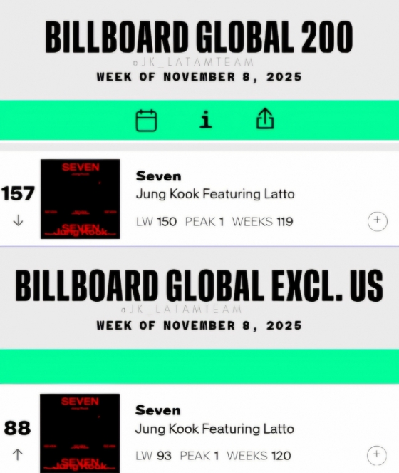 此外,《Seven》在11月8日的“全球(美国除外)”榜单中位列第88位,成为亚洲个人歌手首次且连续120周进入该榜单的纪录保持者。