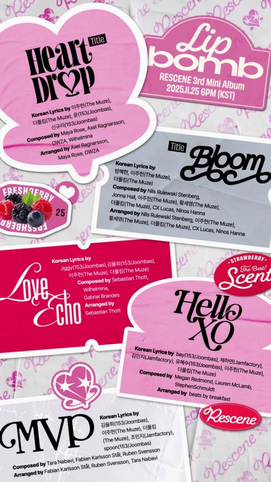 RESCENE于17日通过官方社交媒体平台,公开了将于25日发行的第三张迷你专辑《Lip Bomb》的完整曲目列表。