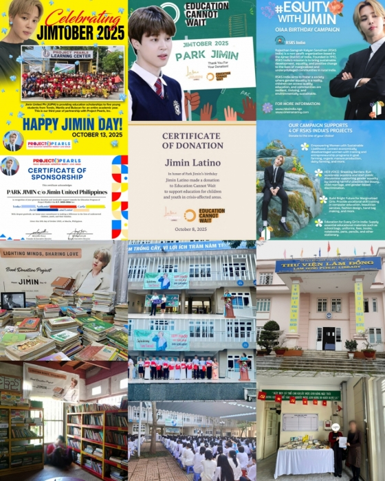 越南JIMIN粉丝运营的公益基金“Light Charity Fund”向Lam Dong省图书馆捐赠图书200余册。另一名粉丝则发起“Jimin's Bookshelf”慈善项目,为在艰苦环境中仍取得优异成绩的Nguyen Khuyen高中44名优秀学生提供奖学金,以此纪念JIMIN生日。