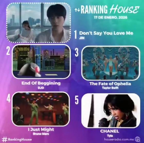 这一人气在2026年持续升温。《Don't Say You Love Me》在新年依然广受喜爱,于1月17日(当地时间)公布的Ranking House榜单中再度登顶。House Radio以“Jin效应!(¡EFECTO JIN!)”为题,宣布这位BTS成员、韩国艺人Jin首次登上Ranking House榜首,向其致以热烈祝贺。