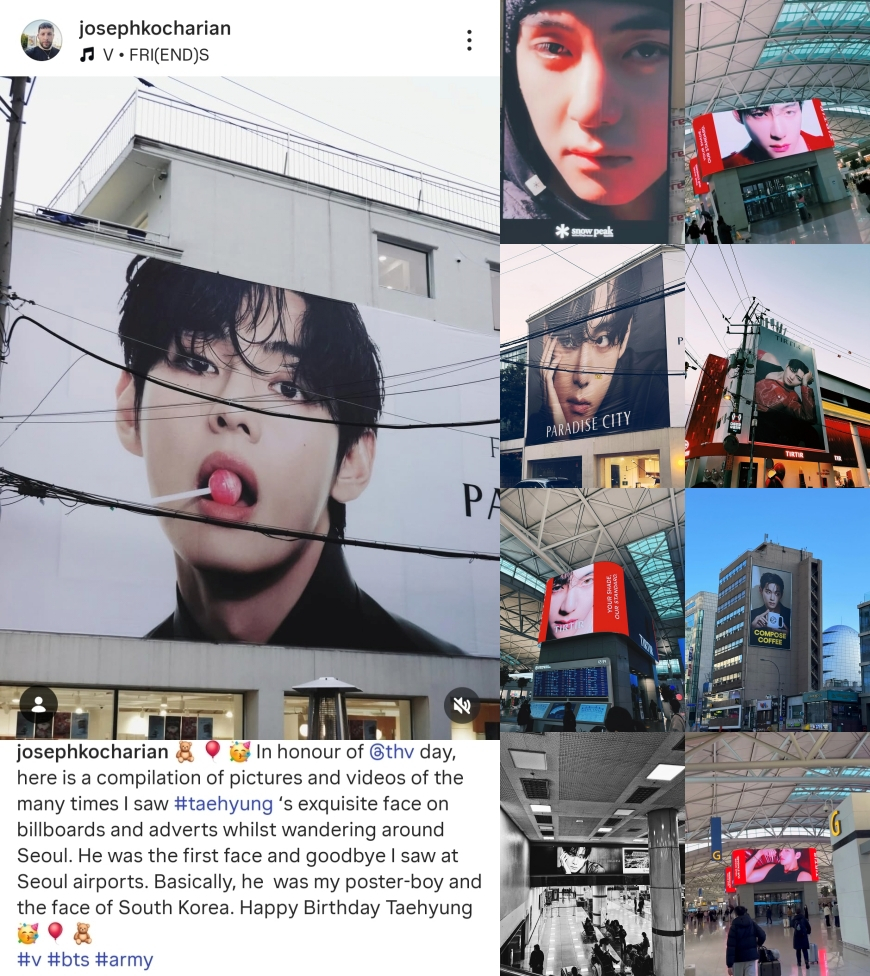 ジョセフ·コーチャリアンが掲載した写真には、ヴィがアンバサダーとして参加しているティルティル、パラダイスシティ、スノーピーク、コンポーズコーヒーなどのブランド広告が含まれた。 ジョセフが訪れたソウルでは、彼の言葉のように、ヴィの姿をどこでも見ることができた。 Vがキャンペーンをするブランド広告はもちろん、Vの誕生日を祝う映像と広告板が空港、ホテル、大型ビル、地下鉄、シェルター、都心主要道路、公園、漢江などソウルのランドマークの随所を飾った。