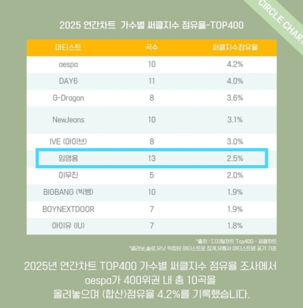 サークルチャートの「歌手別占有率」は該当年度TOP400に進入した曲のサークル指数(ストリーミング、ダウンロード、BGM数値など合算)を基盤に算出される。 イム·ヨンウンは2024年に続き2025年にも最上位圏を維持し、一時的な人気ではなく「ロングラン」のアイコンであることを立証した。