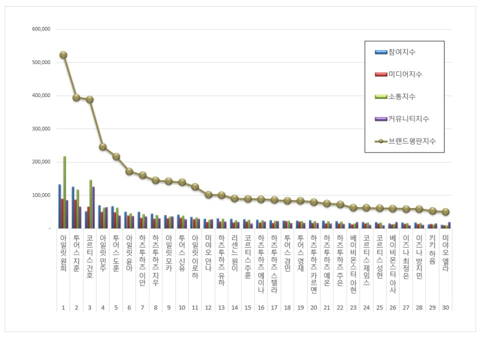新人アイドル個人ブランド評判は、ボーイズグループとガールズグループを統合したブランドカテゴリー分析で、新人アイドル個人ブランドに対する消費者の参加指数、メディア指数、コミュニケーション指数、コミュニティ指数を測定し、ブランド評判指数を分析した。