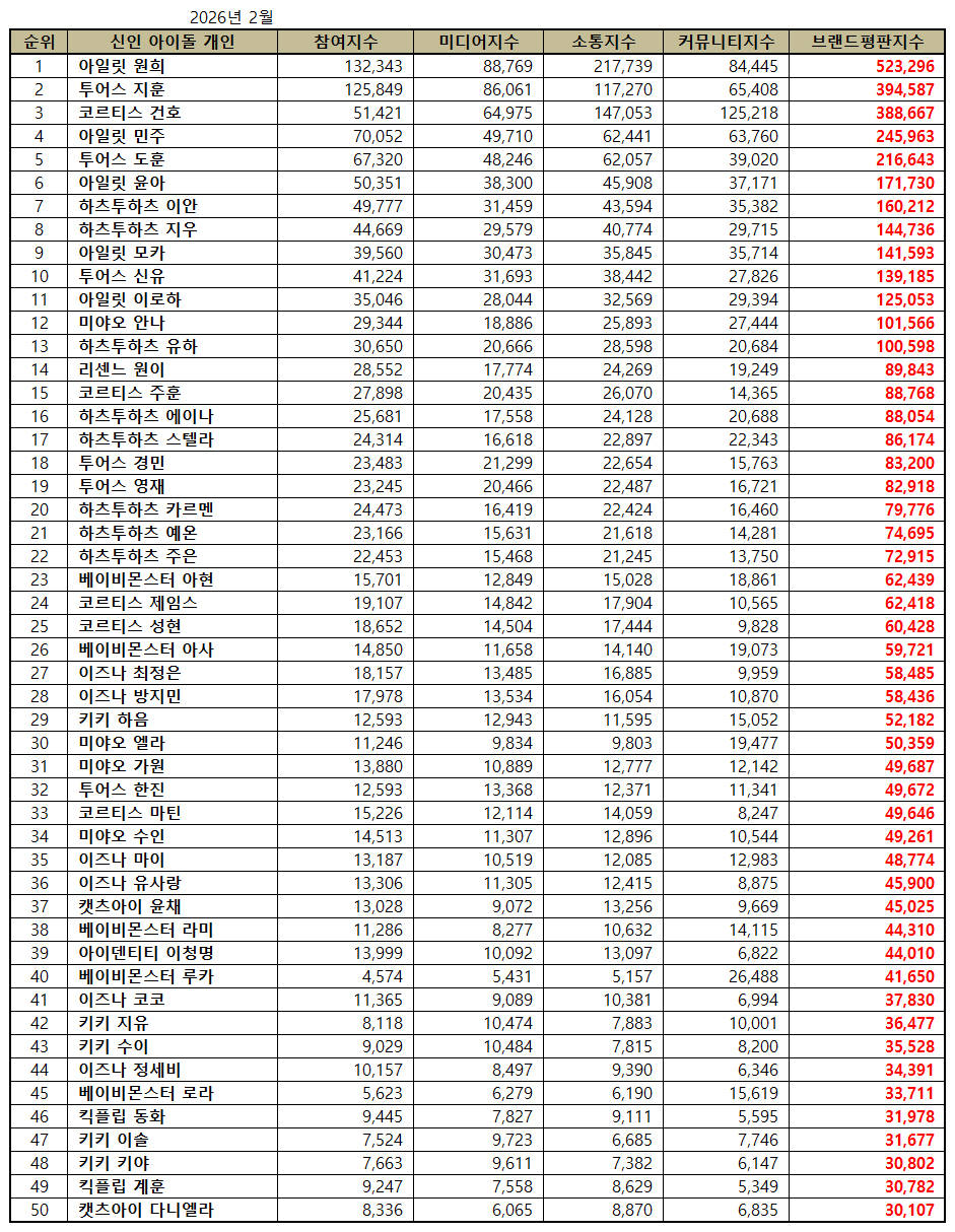 新人アイドル個人ブランド評判2026年2月の分析では、アイレット·ウォニ、ツアーズジフン、コルティス·ゴンホ、アイレット·ミンジュ、ツアーズドフン、アイレット·ユナ、ハーツ·トゥ·ハーツ·イアン、ハーツ·ウァーツ·モカ,ツアーズ真由,アイレットイロハ,宮尾杏奈,ハーツ·ユハ,リセンヌ·ウォンイ,コルティスのチュフン,ハーツ·トゥハーツ カルメン, ハーツ·ジェーヴュンナ , ハッツ シュスター ジュウツォース キョンミン ,ツアーズーグーン、 イズナ·ユサラン、キャッツアイのユンチェ、ベビーモンスターのラミー、アイデンティティのイ·チョンミョン、ベビーモンスターのルカ、イズナ·ココ、キキジユ、キキ·スイ、イズナ·チョンセビ、ベビーモンスターのローラ、キックフリップ童話、キキ·イ·ソル、キ·キーヤ,キックフリップのケフン,キャッツアイのダニエラを分析した。