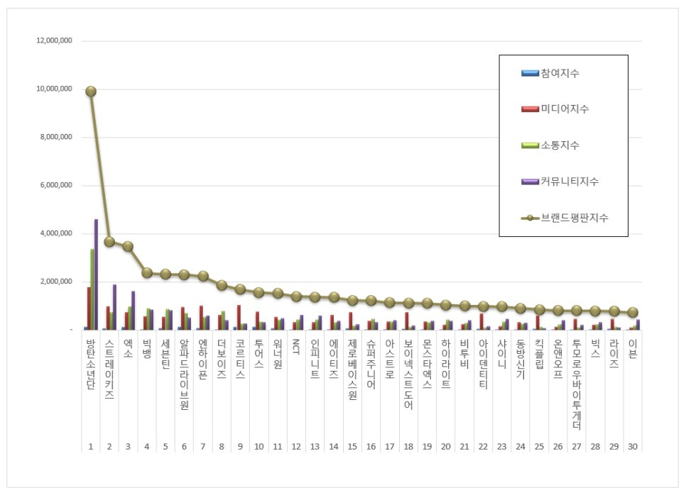 ボーイズグループブランド評判1位を記録したBTS(RM、ジン、シュガ、ジェイホープ、ジミン、ヴィ、ジョングク)ブランドは参加指数147,412メディア指数1,786,972疎通指数3,361,084コミュニティ指数4607,910になり、ブランド評判指数9903,378と分析された。 今年1月のブランド評判指数7,976,571と比べると24.16%上昇した。