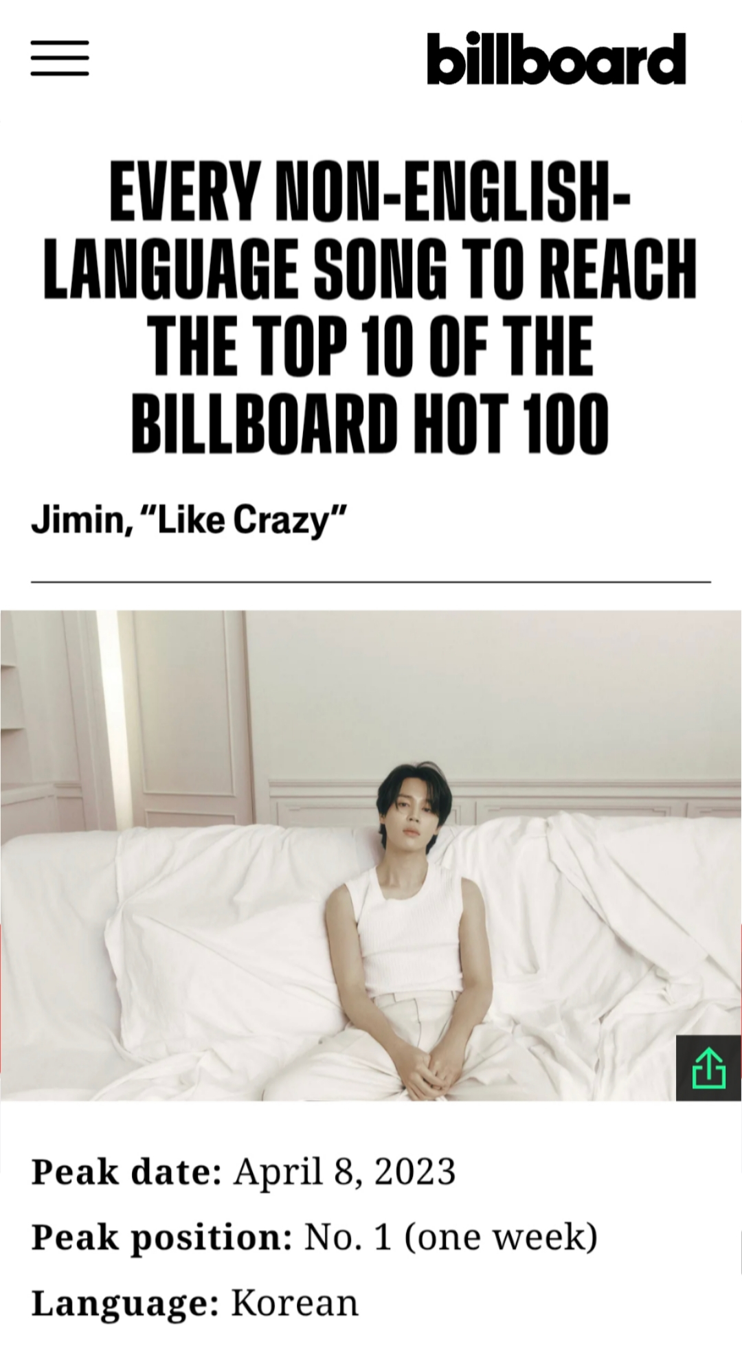 ビルボードの記事[Every Non-English-Language Song to Reach the Top 10 of the Billboard Hot 100]によると、ビルボード68年の歴史でメインソングチャート「ホット100」トップ10に進入した非英語曲は計39曲だ。 この中で1位を占めた歌はたった10曲に過ぎず、その中で韓国語曲はBTSの「Life Goes On」(ライフ·ゴーズ·オン)、BTSとコールドプレイの協業曲「My Universe」(マイ·ユニバース)、そしてジミンの「ライク·クレイジー」など3曲だけだ。