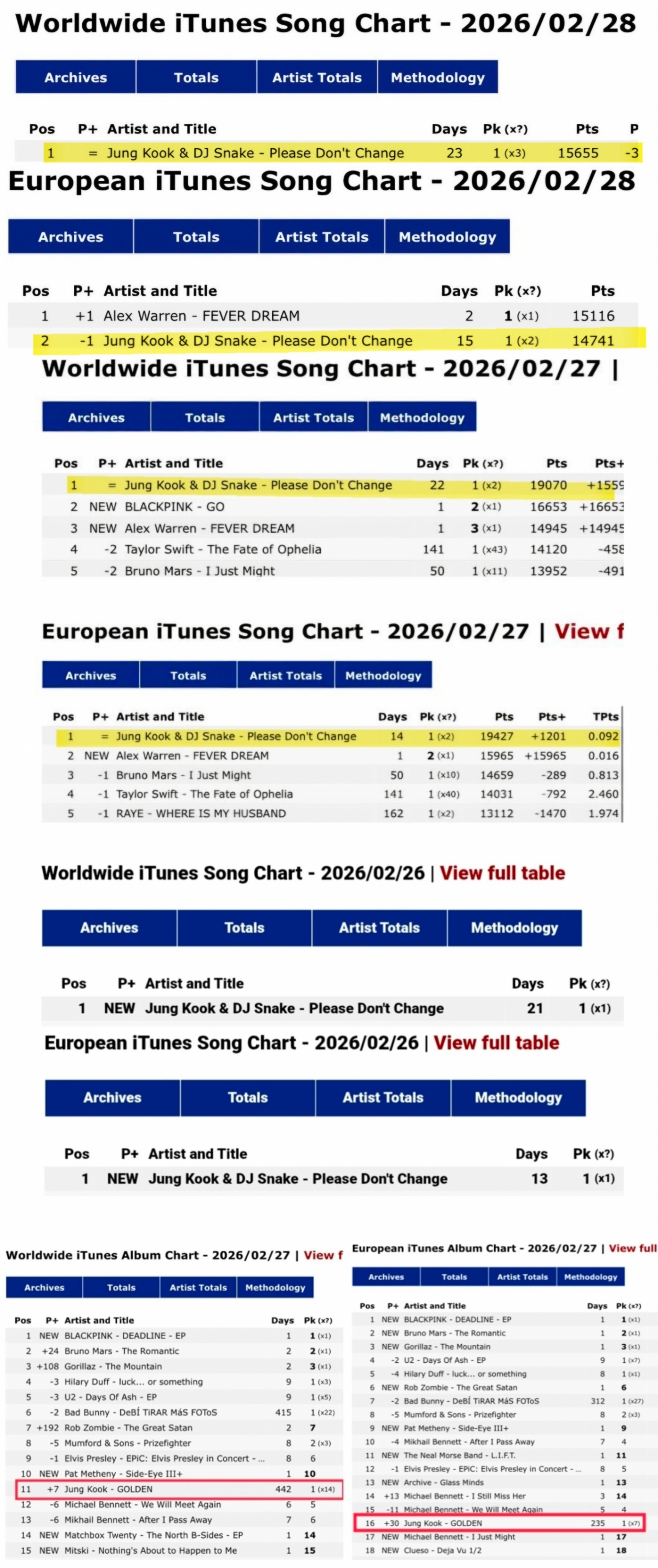 ジョングクのアルバム「GOLDEN」はワールドワイドとヨーロピアンアイチューンズアルバムチャートでそれぞれ11位と16位を記録した。 また、両チャートでK-POPソロ歌手アルバムの中で最長期間である通算442日と235日間滞在した。
