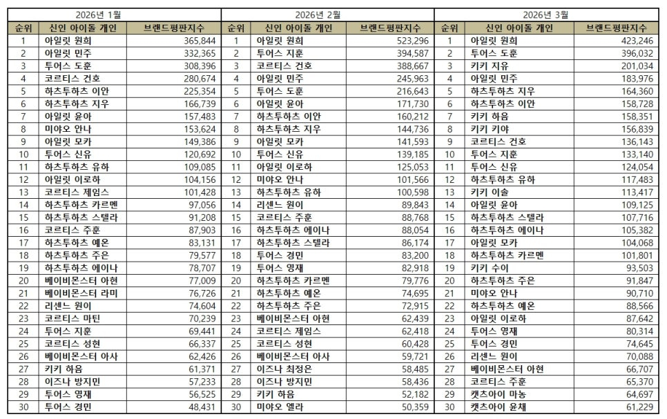 2026年3月、新人アイドル個人ブランド評判30位 順位はアイレット·ウォニ、ツアーズ·ドフン、キキ·ジユ、アイレット·ミンジュ、ハーツ·トゥ·ハーツ·イアン、キキ·ハウム、キキヤ、コルティスガンホ,ツアーズジフン,ツアーズシンユ,ハーツ·ユハ,キキイソル,アイレットユンア,ハーツ·トゥハーツステラー,ハーツ ジュリー, ハーツゥ ハーツ エイナ , アイレットモカ , ハツ カルメン , キッキー スーヒッツ ジュルツ ヤオズ イェルオーン 。