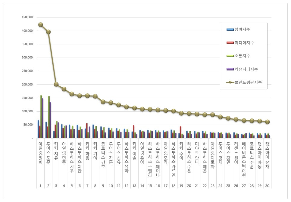 新人アイドル個人ブランド評判は、ボーイズグループとガールズグループを統合したブランドカテゴリー分析で、新人アイドル個人ブランドに対する消費者の参加指数、メディア指数、コミュニケーション指数、コミュニティ指数を測定し、ブランド評判指数を分析した。