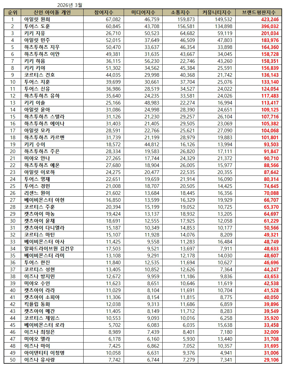 新人アイドル個人ブランド評判2026年3月ビッグデータ分析結果、1位アイレット·ウォンヒ2位TWS(トゥアーズ)ドフン3位キキジユの順と分析された。