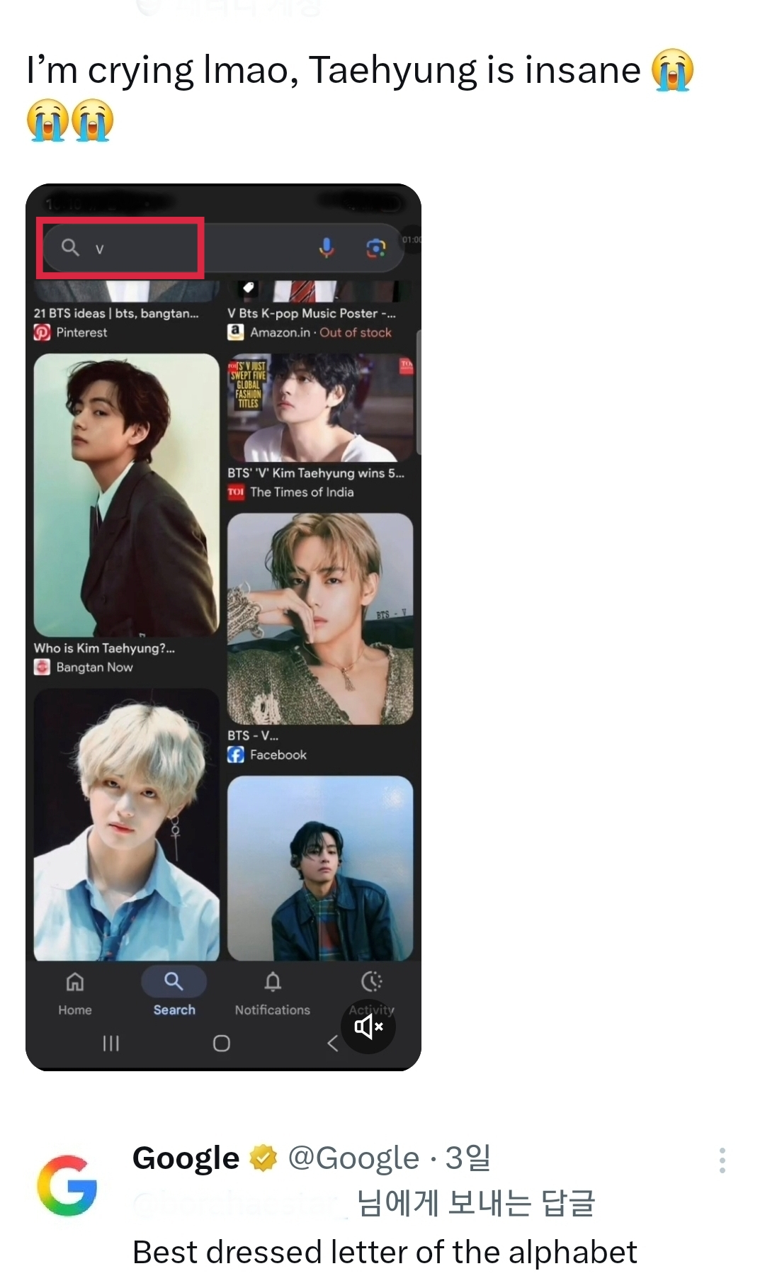 あるファンがグーグルイメージでアルファベットVを検索した時、Vの写真がずっと露出するのを見て「テヒョンは完全に狂っている」(Taehyung is insane)と掲示すると、グーグルX(旧ツイッター)公式アカウントがVを「アルファベットのベストドレス文字」(Best dressed letter of the alphabet)としてコメントを残した。