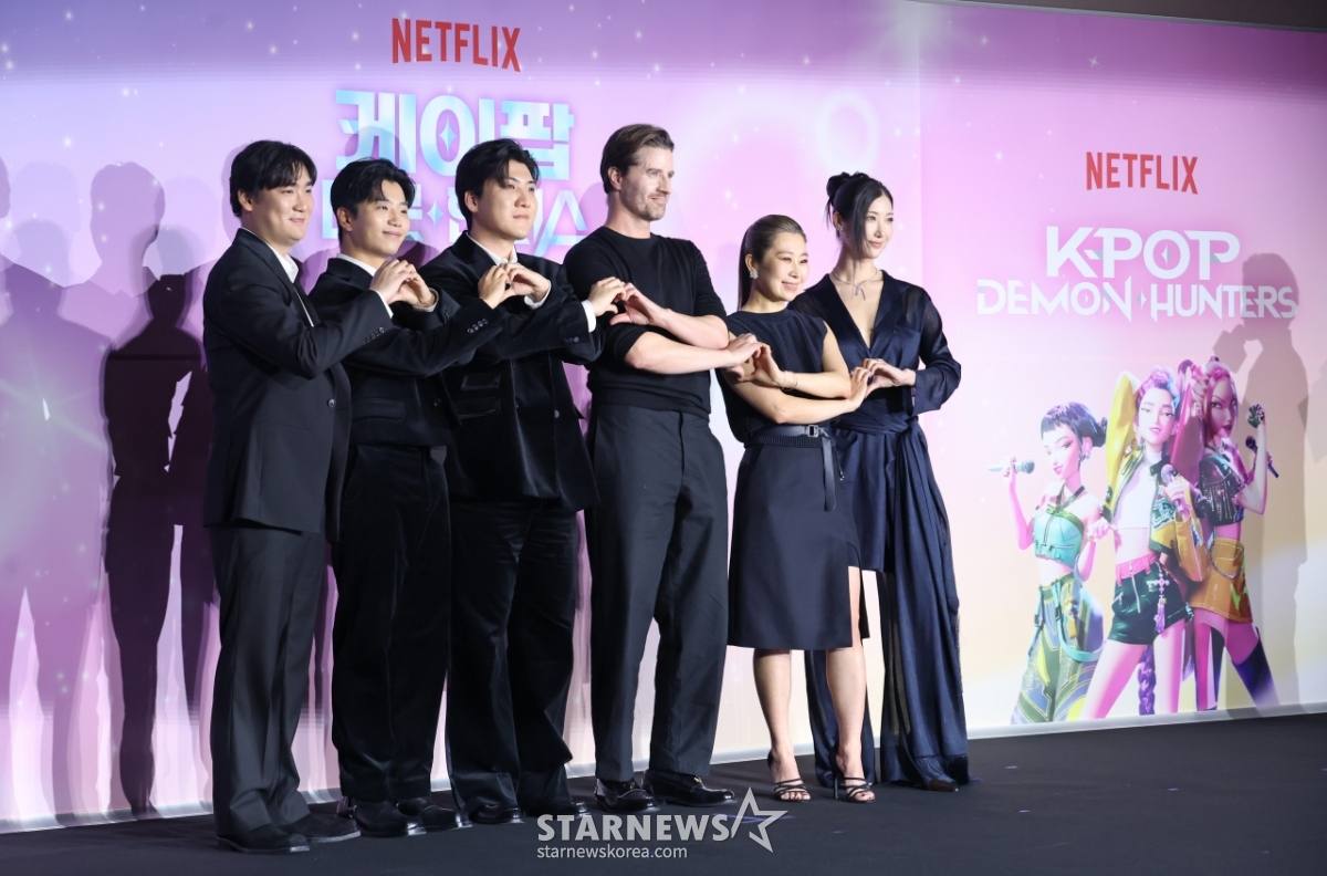 プロデューサーIDO(イ·ユハン、クァク·ジュンギュ、ナム·ヒドン)、クリス·アップルハンス、マギー·カン監督、シンガーソングライターのイ·ジェが1日午後、ソウルCGV龍山アイパークモールで行われたネットフリックス映画「K-POPデーモンハンターズ」アカデミー受賞記念記者懇談会に参加しポーズを取っている。 /2026.04.01