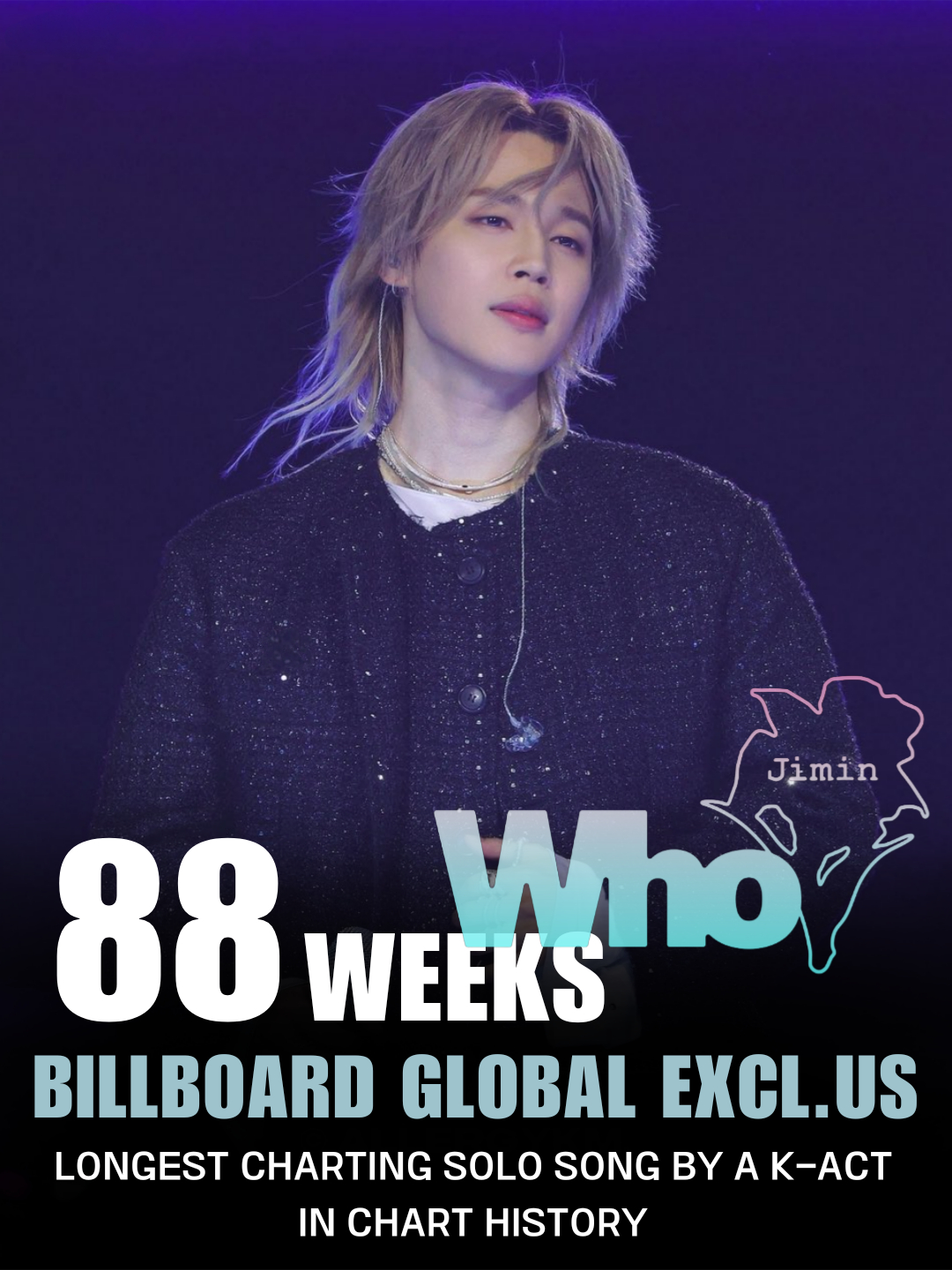 米音楽専門メディアのビルボードによると、ジミンのソロ2枚目のアルバム「MUSE」(ミューズ)のタイトル曲「Who」(後)はビルボードの「グローバルアメリカ除外」(Global Excl。 US) チャートで171位に上がり、88週間チャートインした。
