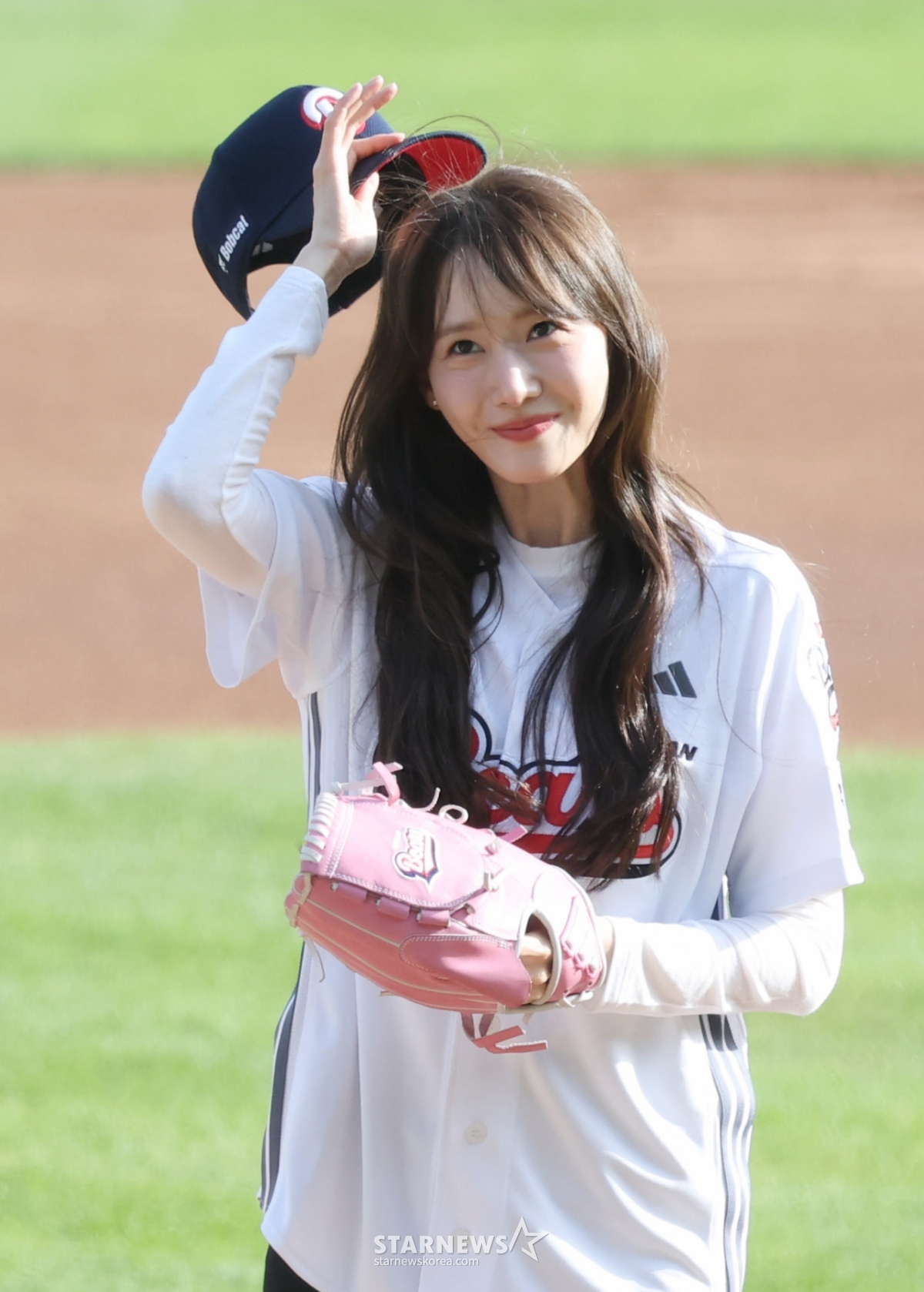 俳優兼歌手の少女時代のユナが斗山の勝利祈願の始球式をしている。