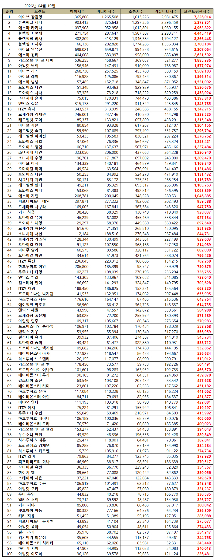 2026年4月、ガールズグループの個人ブランド評判100位のブランドは、アイブ·チャンウォニョン、ブラックピンク·ジェニー、エスパカリーナ、ブラックピンク·ロゼ、ブラックピンク·ジス、アイブ·アン·ユジン、エスパウィンター、キス·オブ·ライフナティ,アイブリーズ,アイブリーズ,エスパニング,TWICEナヨン,TWICEサナ,少女時代ユナ,エンミックスソルユン,ITZYユナ,ルセラフィムキムチェウォン,レッドベルベットジョイ,アイブズ,アイブ秋,レッドベルベットスルギ,Red Velvetのアイリーンズ,TWICEジヒョ,TWICEジョンヨン少女時代テヨン. 少女時代テヨン,少女時代の水泳時代の、 ルセラフィム咲良、キキハウム、オーマイガール幼児、TWICEチェヨン、ルセラフィムホ·ユンジン、少女時代ソヒョン、ルセラフィムカズハ、オーマイガールヒョジョン、ママムソラ,オーマイガールアリン,ITZYリュジン,ハーツツーハーツイアン,宇宙少女ダヨン,エンミックスリリー,ガールズデイミンア,ITZYチェリョン,プロミスナインパク·ジウォン,ハーツジウ,Apinkパク·チョロン,エンミックスヘウォン,ルセラフィムホン·ウンチェ,アイレットミンジュ,プロミスナインソンハヨン,エンジウ,ガールズデイユースデイ·ユラフィム·ハクジ·ベイビー·ユラフィム、 宮尾アンナ、ITZYイェジ、宇宙少女スビン、ハーツツーハーツエイナ、ベビーモンスターローラ、キスオブライフジュリー、宇宙少女ヨンジョン、ハーツツーハーツイェオン、トリプルエスキム·チェヨン,ハーツツーハーツカルメン,ITZYリア,フィフティフィフティハナ,オーマイガールユビン,ハイキーイェル,ステイシウン,ハーツツーハーツジュウン,アイレットモカ,ウウウウウウヨン ,アリスソヒ , キキヤ , キャッツアイマノン , キキジユ , フィフティフティフティフティフティシャネル , チェキ , ウィキ 。
