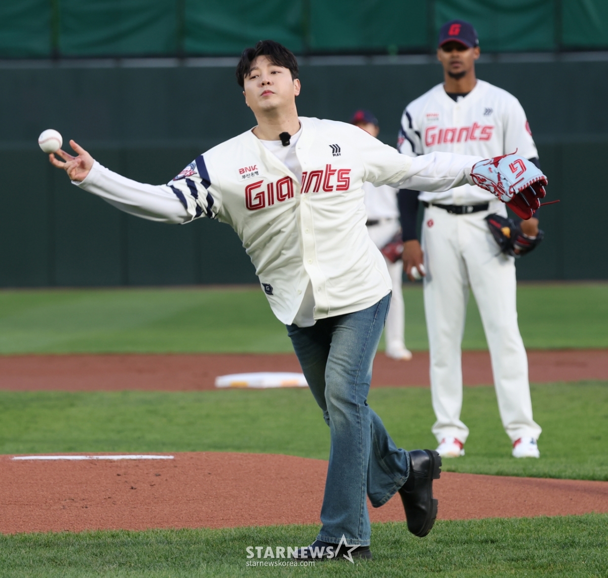 トロット歌手のカン·ソルミンがロッテの勝利祈願の始球式をしている。