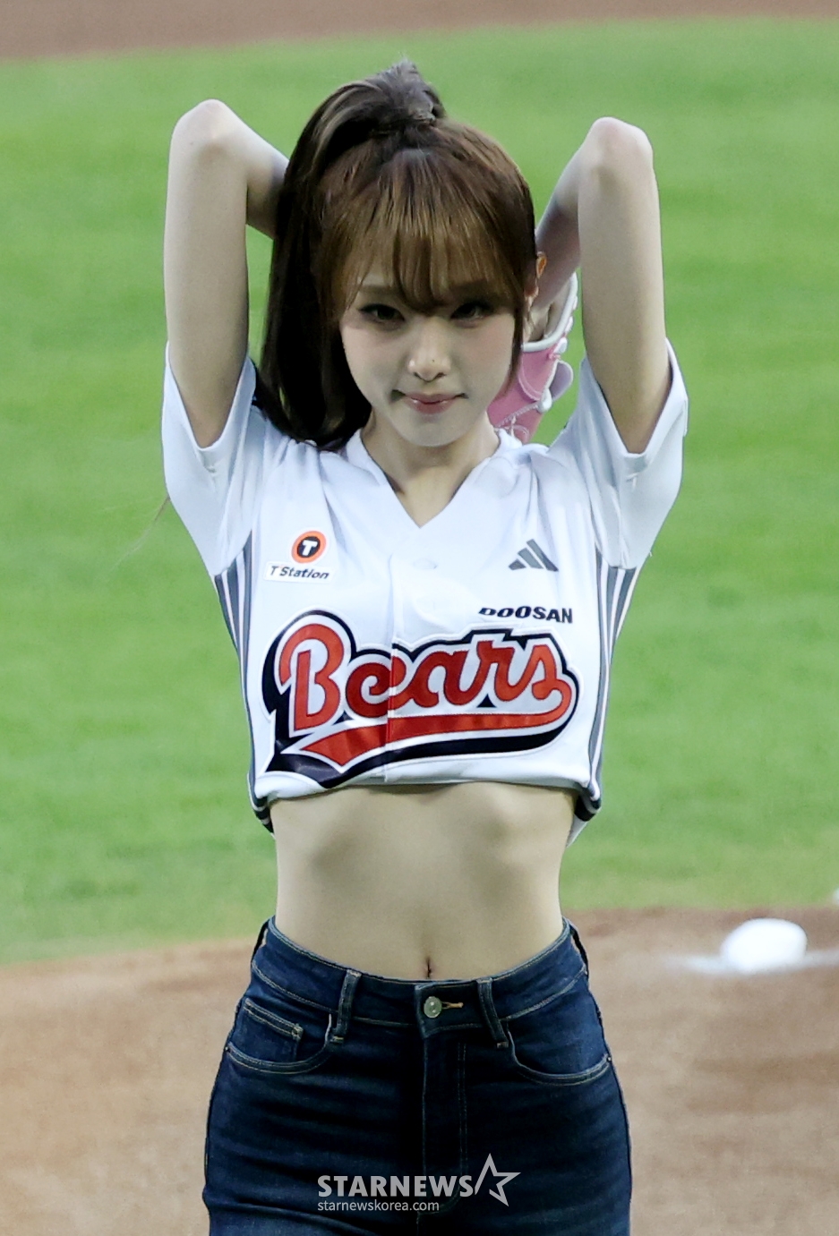歌手のチェ·イェナ(YENA)が斗山(トゥサン)の勝利祈願の始球式をしている。