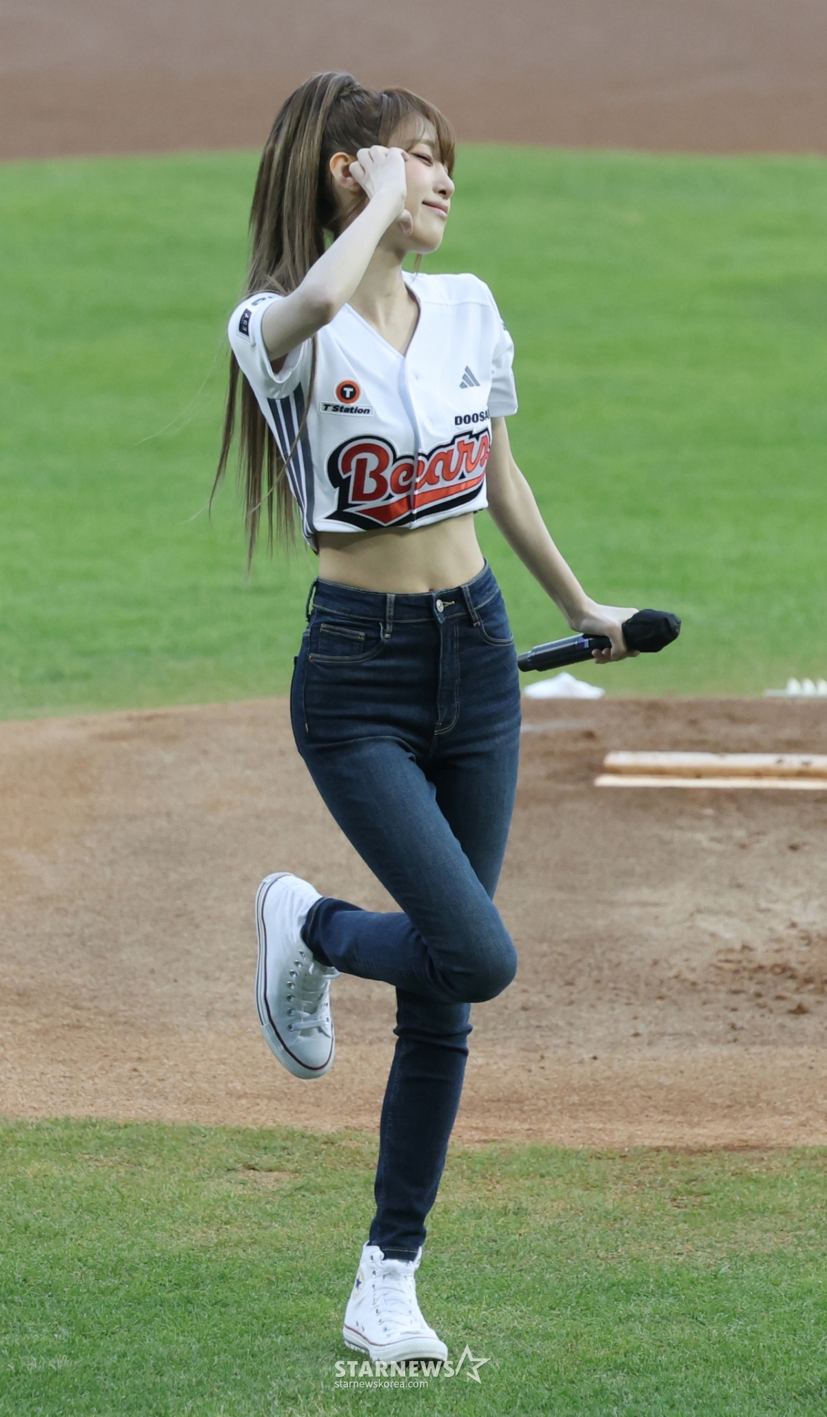 歌手のチェ·イェナ(YENA)が斗山(トゥサン)の勝利祈願の始球式をしている。