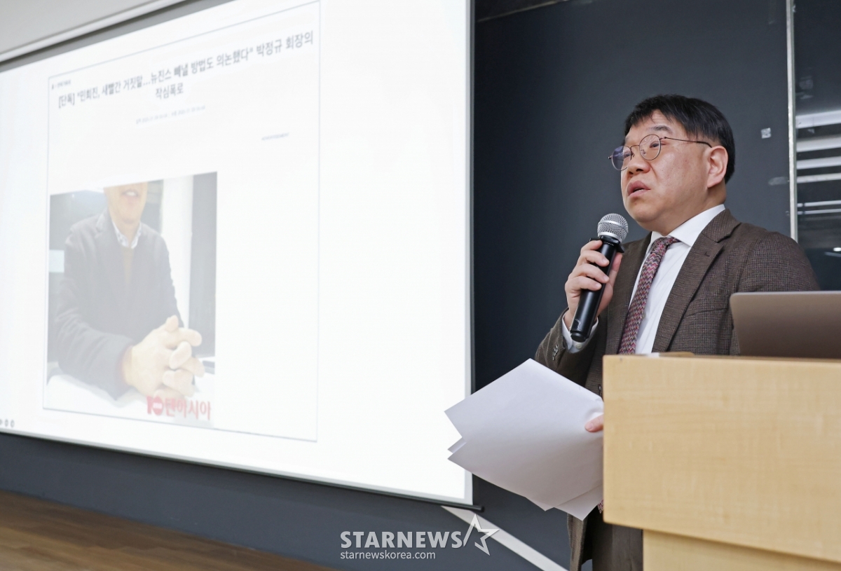 28日午前、ソウル鍾路区郵政局路6教員鐘閣ビルで進行されたミン·ヒジン前オドア代表「ニュージンスタンパリング」疑惑関連公開記者会見でキム·ソンウン弁護士が質問に答えている。 /2026.01.28