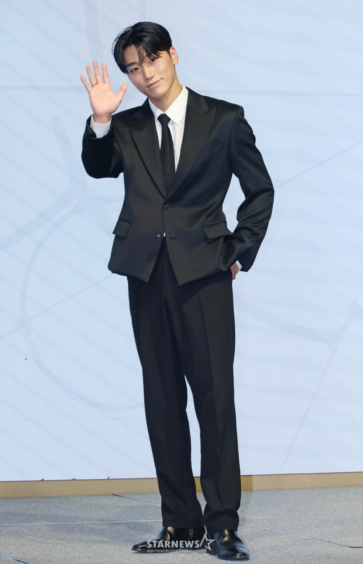 グループATEEZ山が5日午後、ソウル汝矣島のフェアモントアンバサダーホテルで行われたミニ13集「ゴールデンアワー:パート4」(GOLDEN HOUR:Part.4)発売記念記者懇談会に先立ってポーズを取っている。 /2026.02.05