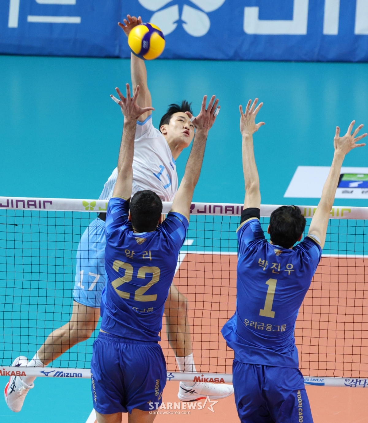 大韓航空のイム·ドンヒョクがウリカードのアリとパク·ジヌのブロッキングの上に強烈なスパイクを飛ばしている。