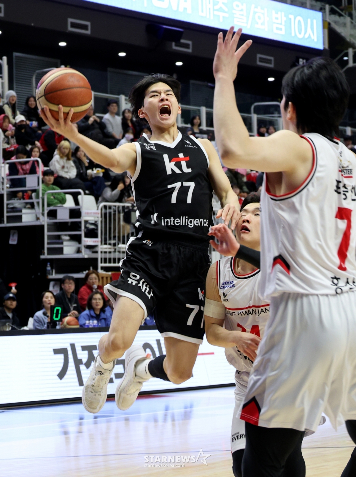KTのカン·ソンウクが21日、水原ktソニックブームアリーナで開かれた2025-2026プロバスケットボールKTと正官庄の試合1クォーター開始とともにドライブインを試みている。 ゴールにはつながらなかった..202601.21.