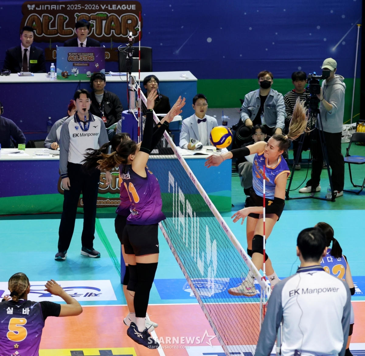 Kスターのレベッカが25日、春川湖畔体育館で開かれた2025-2026ジンエアーVリーグオールスター戦2セット女子部の試合で、強烈なスパイクを打っている。 2026. 01.25.