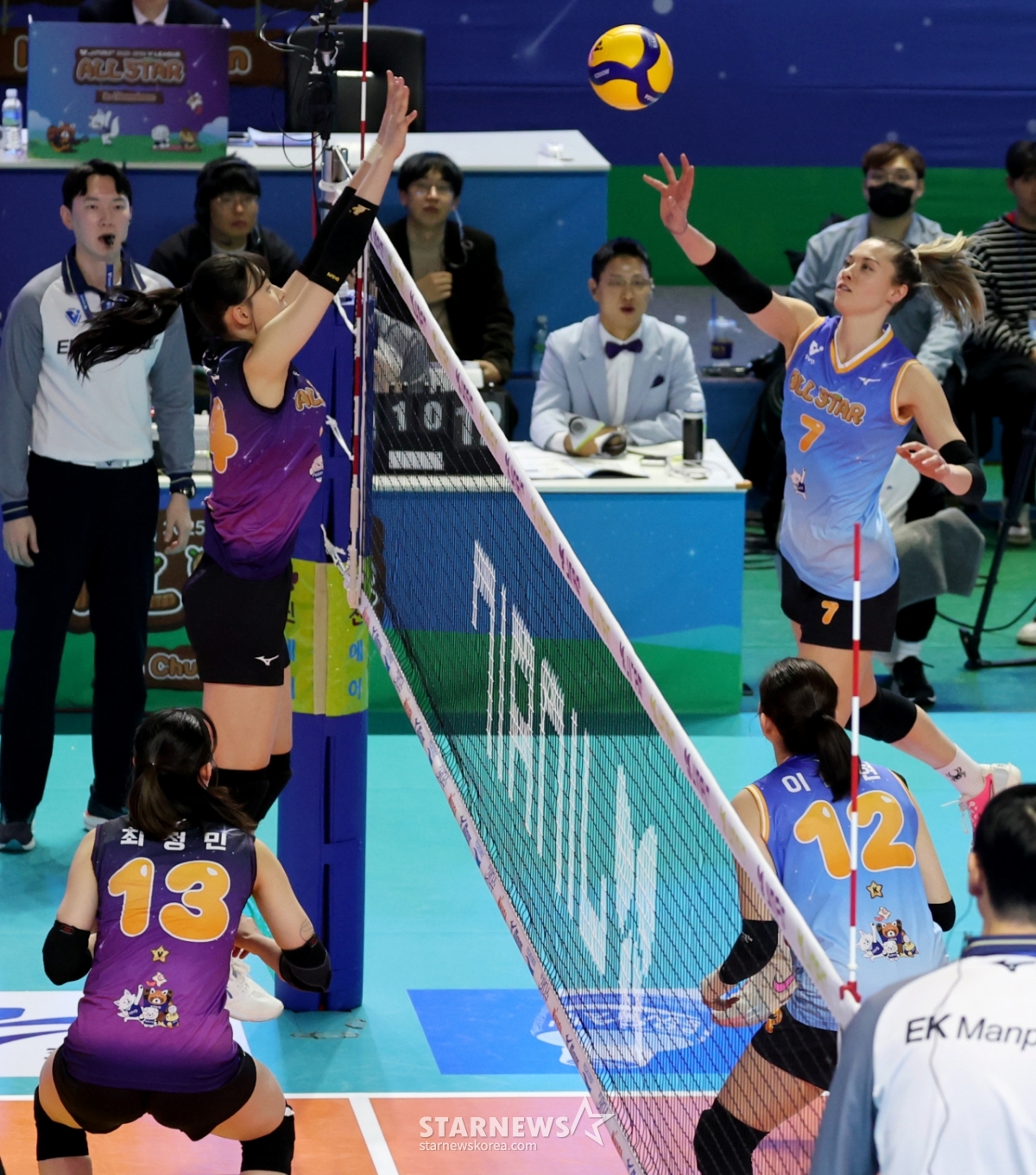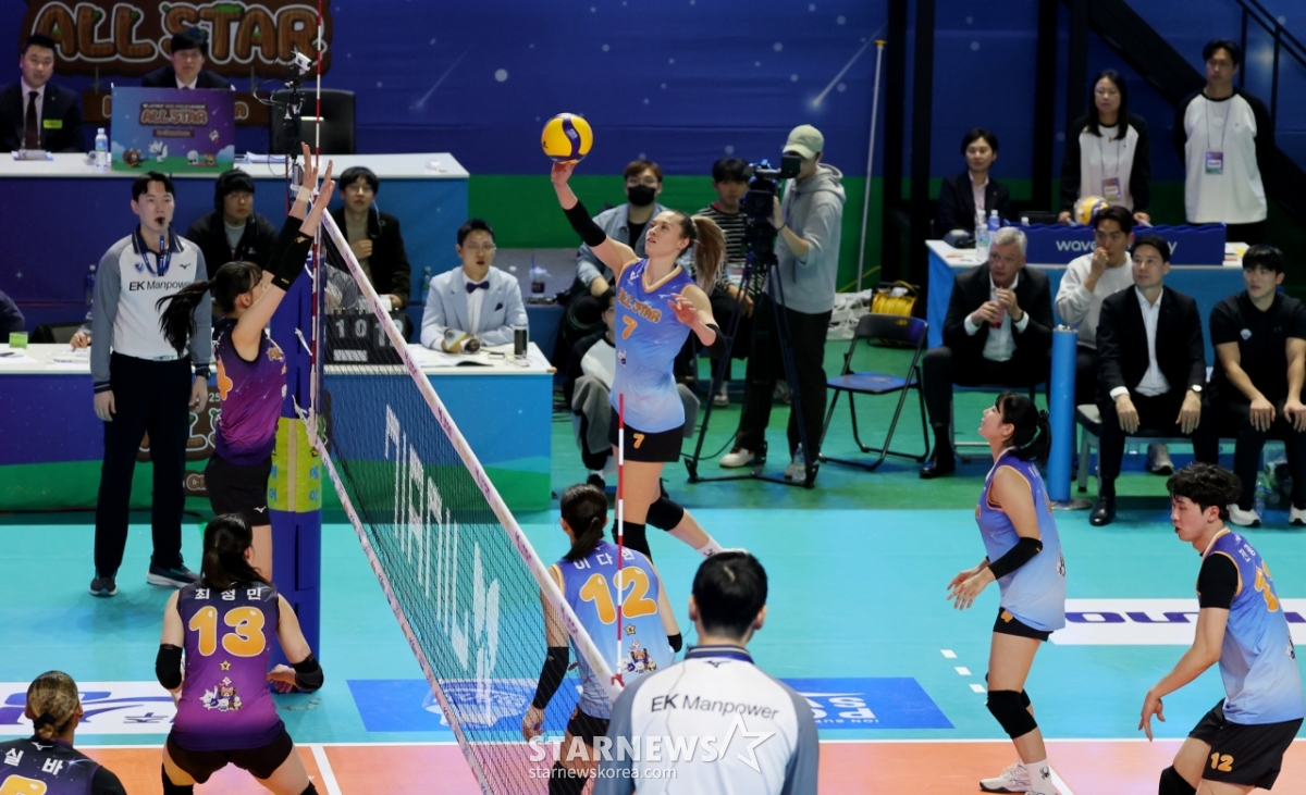 *このコンテンツはAIによって翻訳されました。Kスターのレベッカが25日、春川の湖畔体育館で開かれた2025-2026ジンエアーVリーグオールスターゲーム第2セット女子部の試合で連打を試みている。 2026. 01.25.© STARNEWS. 無断転載・再配布禁止*このコンテンツはAIによって翻訳されました。