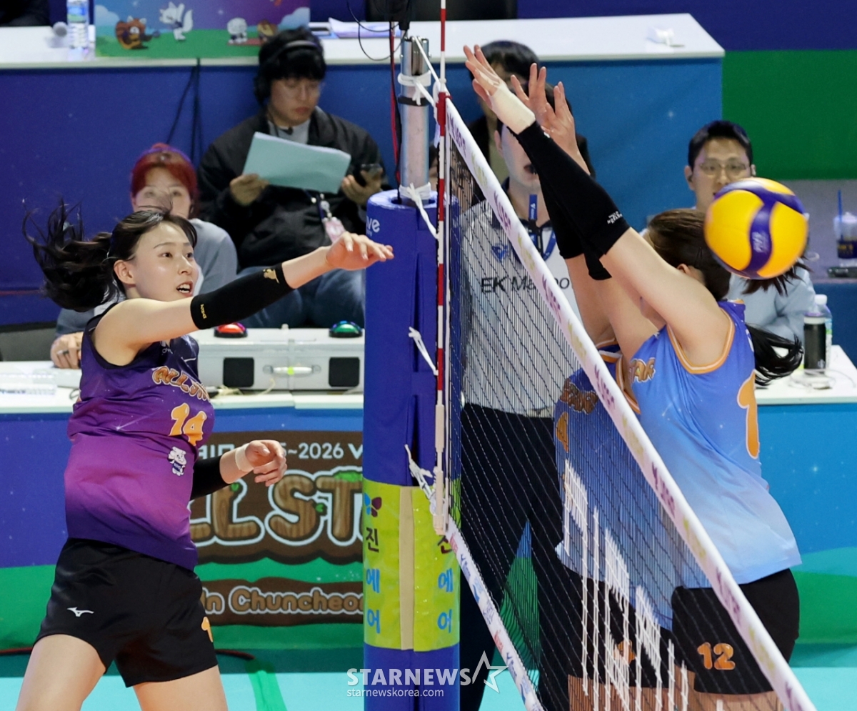*このコンテンツはAIによって翻訳されました。Vスターのイ·ソンウが25日、春川湖畔体育館で開かれた2025-2026ジンエアーVリーグオールスターゲーム第2セット女子部の試合で強打を試みている。 2026. 01.25.© STARNEWS. 無断転載・再配布禁止*このコンテンツはAIによって翻訳されました。