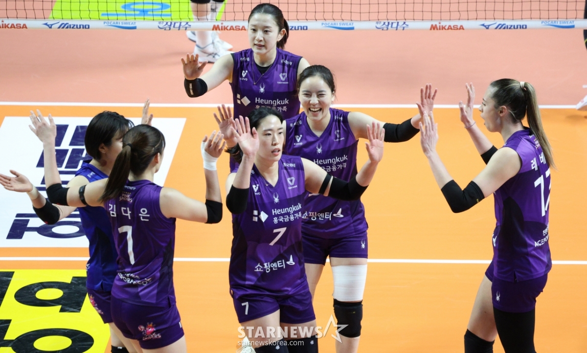 興国生命のイ·ダヒョンが決定的な攻撃を成功させた後、同僚たちと喜んでいる。