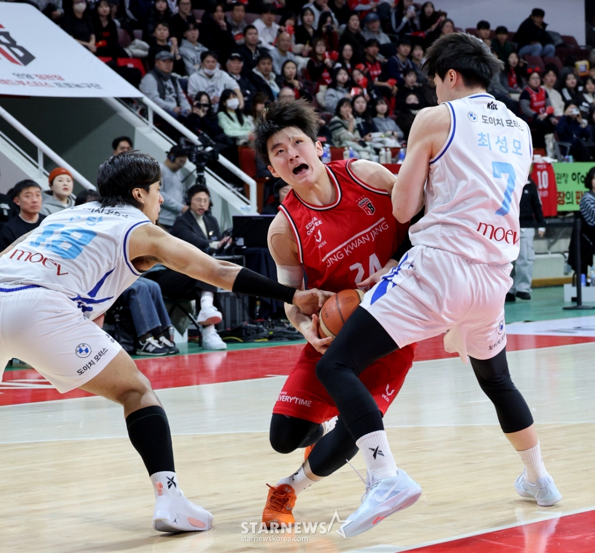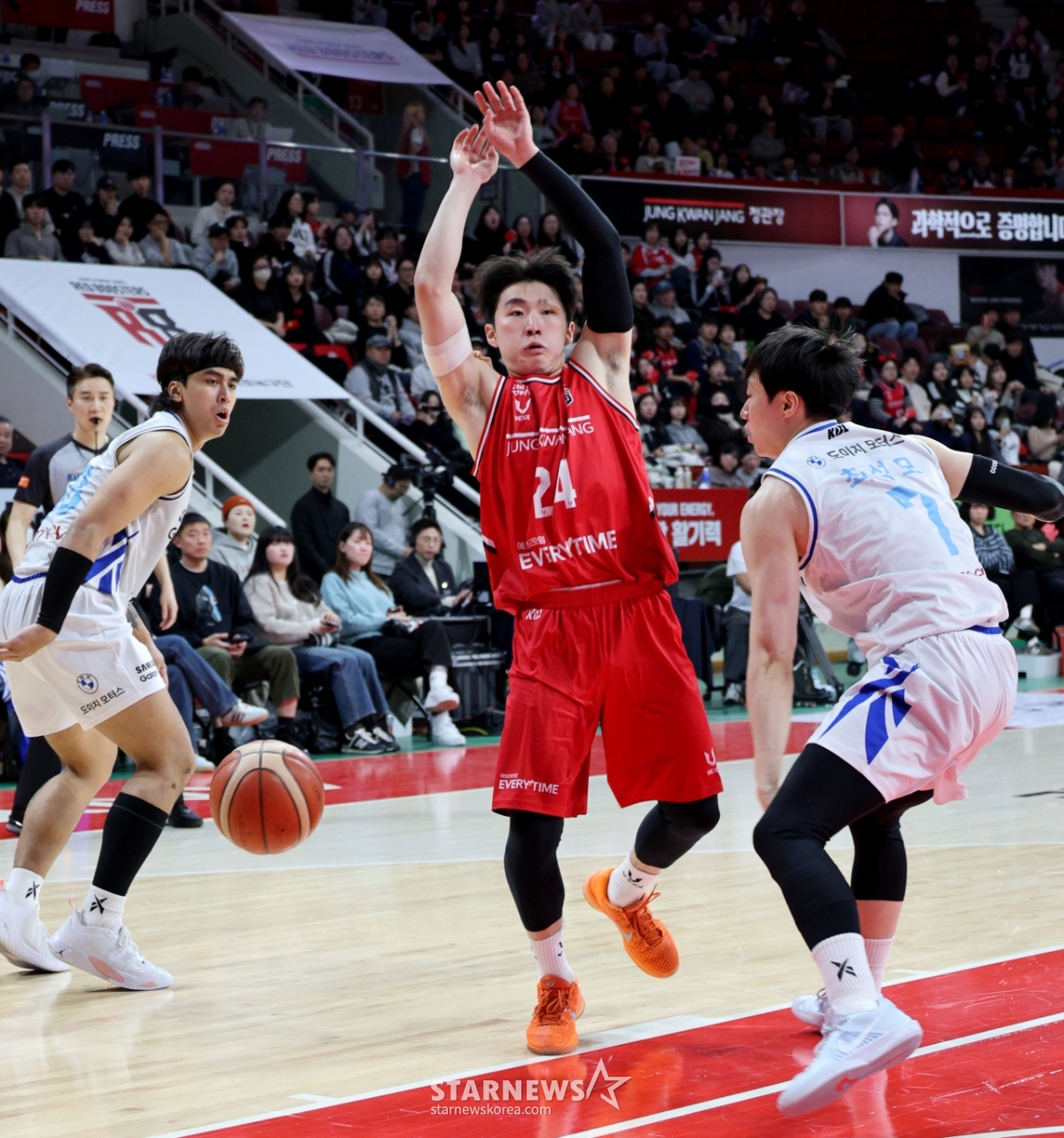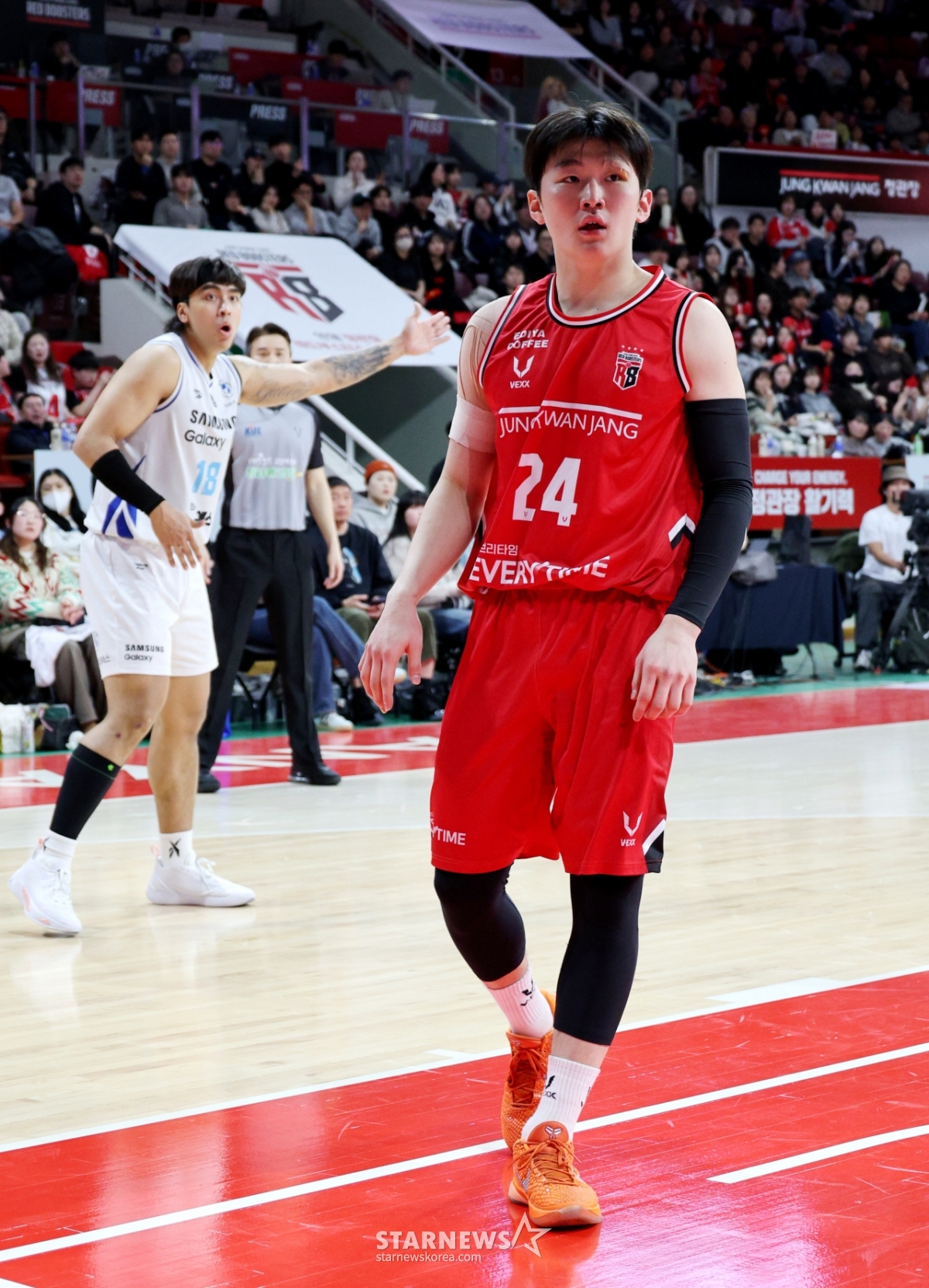 正官庄のムン·ユヒョンが29日、安養(アンヤン)体育館で行われた2025-2026LG電子プロバスケットボール正官庄と三星(サムスン)の試合でファウルにボールを逃している。 2026.01.29.