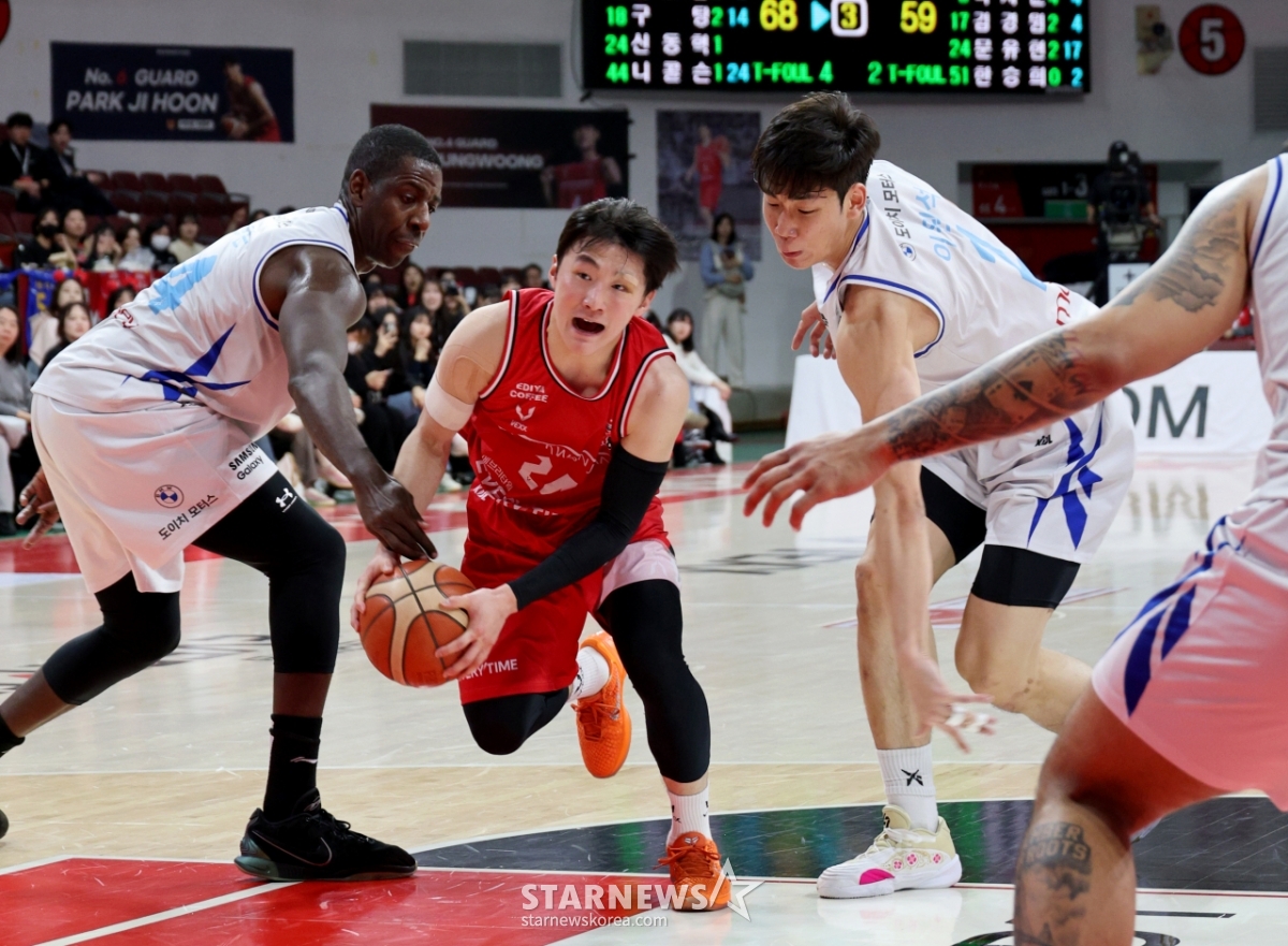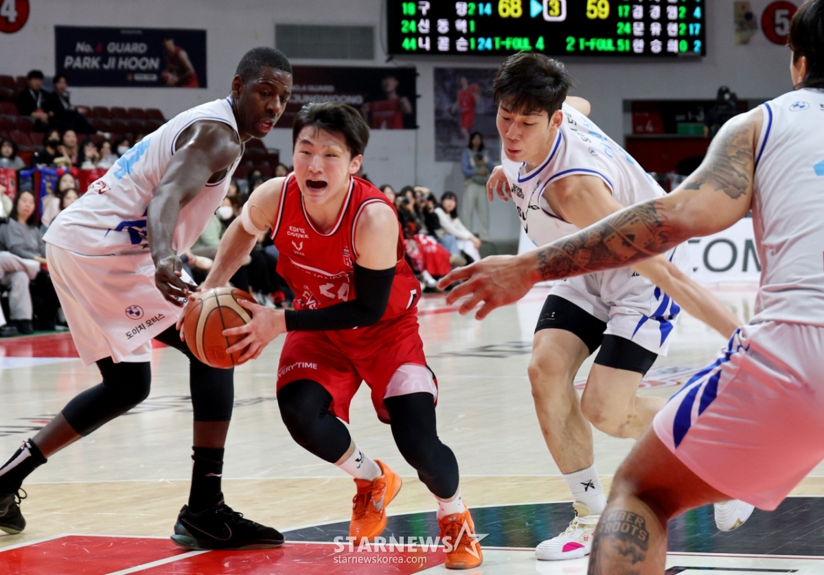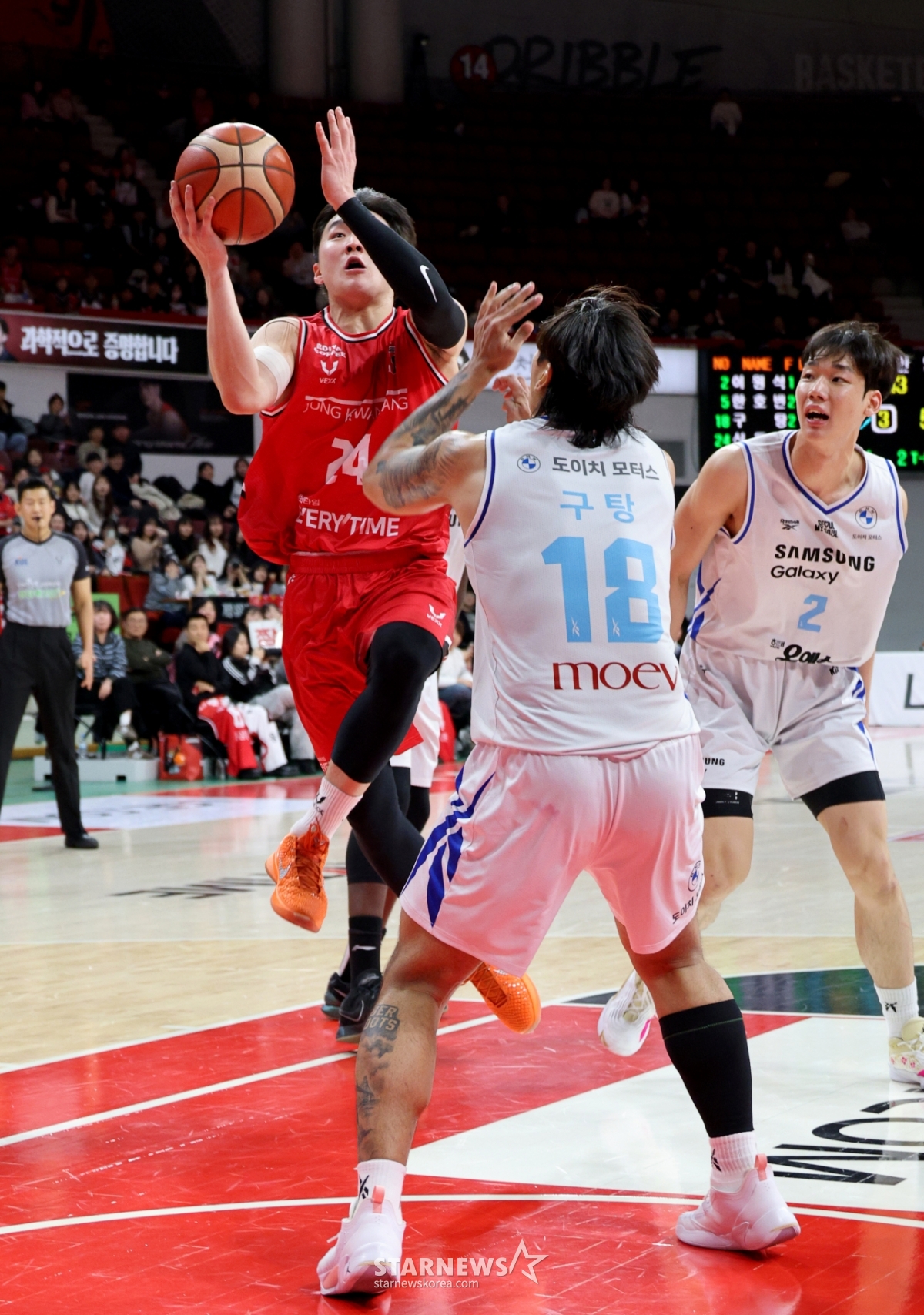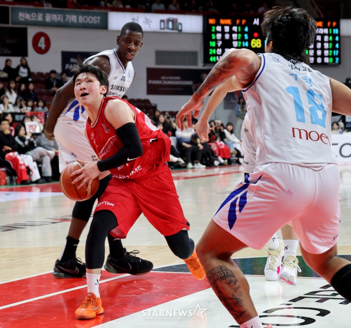 *このコンテンツはAIによって翻訳されました。正官庄のムン·ユヒョンが29日、安養体育館で開かれた2025-2026LG電子プロバスケットボール正官庄とサムスンの試合で、ニコルソンとイ·ウォンソクを引き離し、突破を試みている。 2026.01.29.© STARNEWS. 無断転載・再配布禁止*このコンテンツはAIによって翻訳されました。