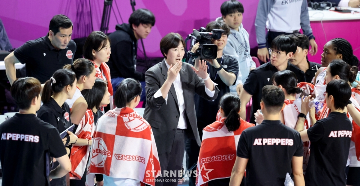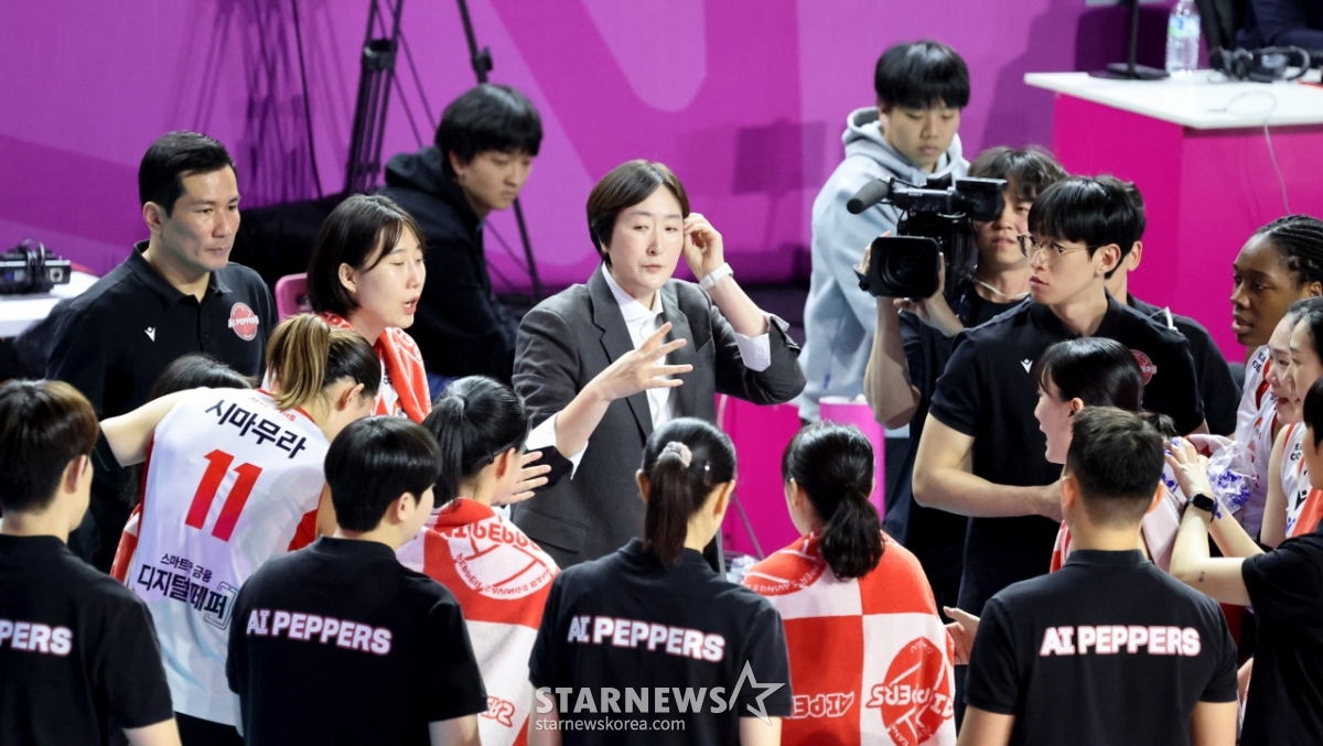 ペッパーのチャン·ソヨン監督が1日、三山ワールド体育館で開かれた2025-2026陣で、Vリーグ興国生命とペッパー貯蓄銀行の試合で作戦指示をしている。 2026.02.01.
