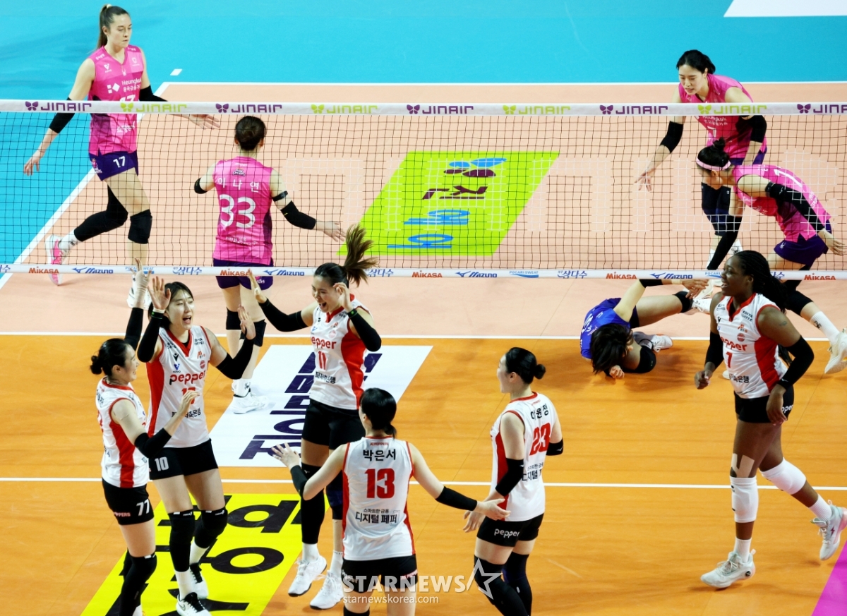 ペッパー選手たちが1日、三山ワールド体育館で開かれた2025-2026ジンで、Vリーグ興国生命とペッパー貯蓄銀行の試合で得点した後、歓呼している。 2026.02.01.