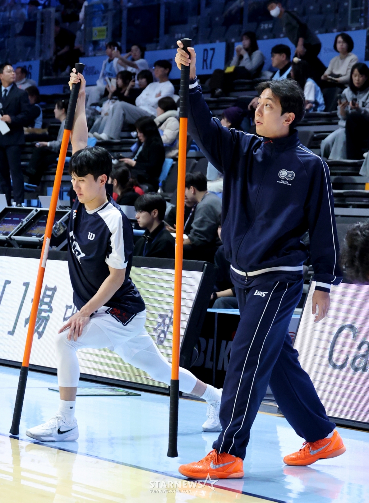 KCCのホ·フンが4日、高陽ソノアリーナで開かれた2025-2026LG電子プロバスケットボール高陽ソノと釜山KCCの試合に先立ってウォーミングアップをしていたところ、チェ·ジングァンとボンギルについて話を交わしている。 2026.02.04.