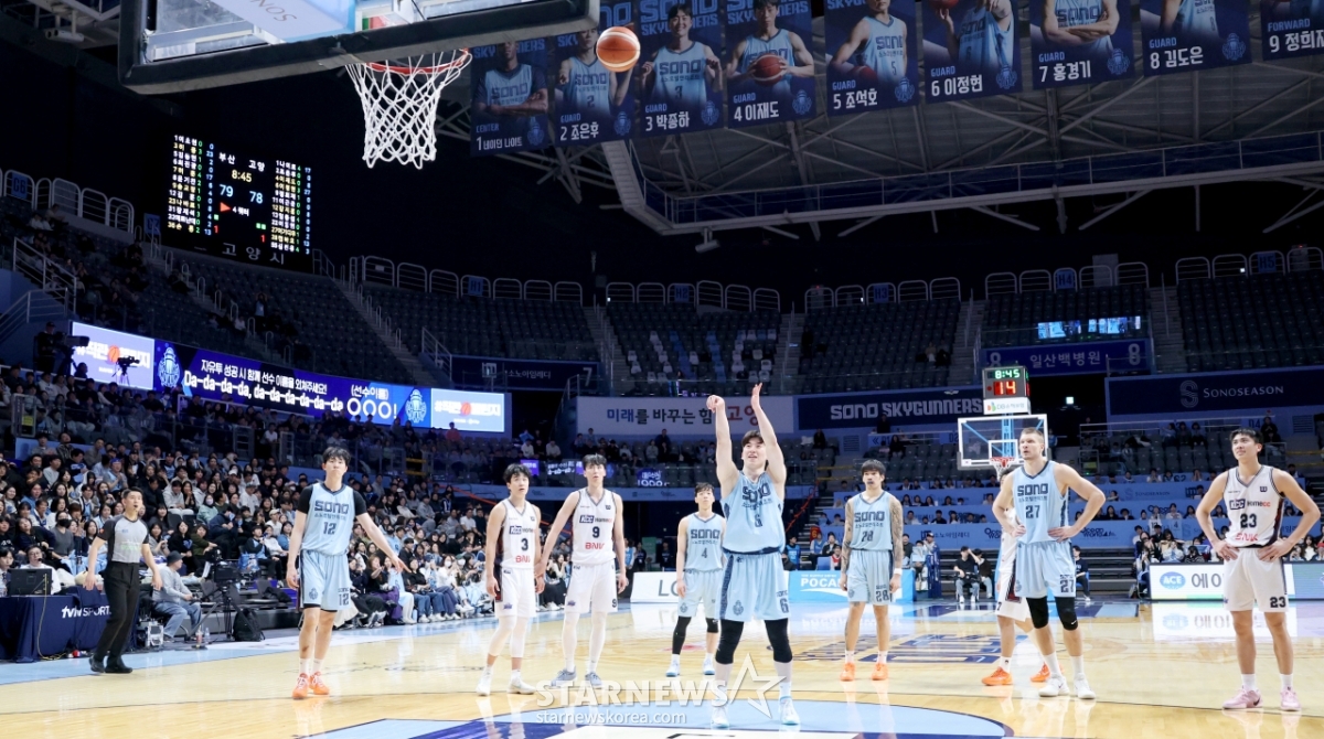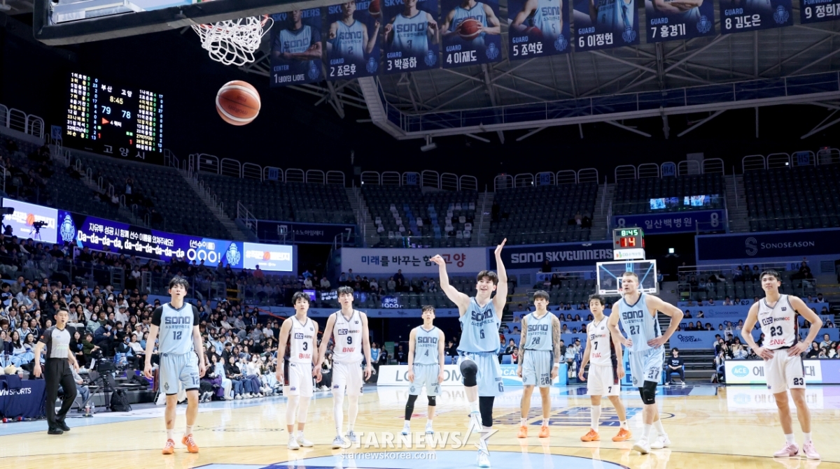 ソノのイ·ジョンヒョンが4日、高陽ソノアリーナで開かれた2025-2026LG電子プロバスケットボール高陽ソノと釜山KCCの試合4クォーター2点シュートに続き、ボーナスショットまで成功させ、同点に追いついている。 2026.02.04.