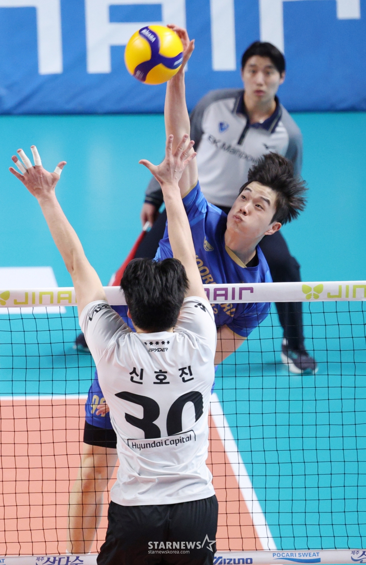 ウリカードのキム·ジハンが現代キャピタルのシン·ホジンのブロッキングの上に強烈なスパイクを飛ばしている。