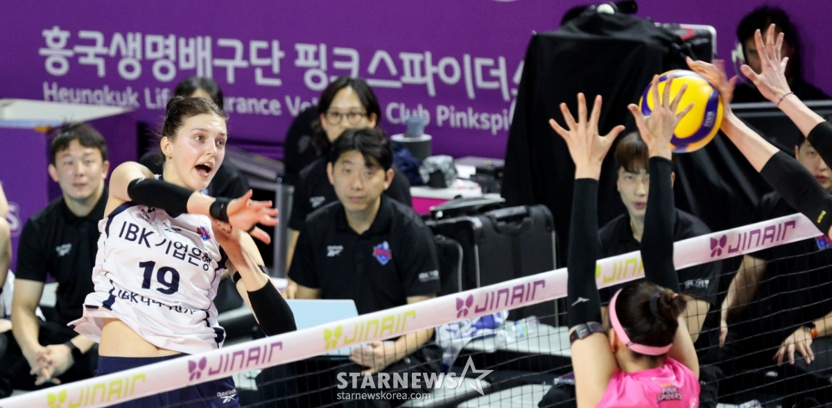 *このコンテンツはAIによって翻訳されました。企業ビクトリアが6日、サムサンワールド体育館で開かれた2025-2026ジンエアーVリーグ女子部興国生命と企業銀行の試合で興国二重ブロッキングに強打を放っている。 2026.02.06.© STARNEWS. 無断転載・再配布禁止*このコンテンツはAIによって翻訳されました。