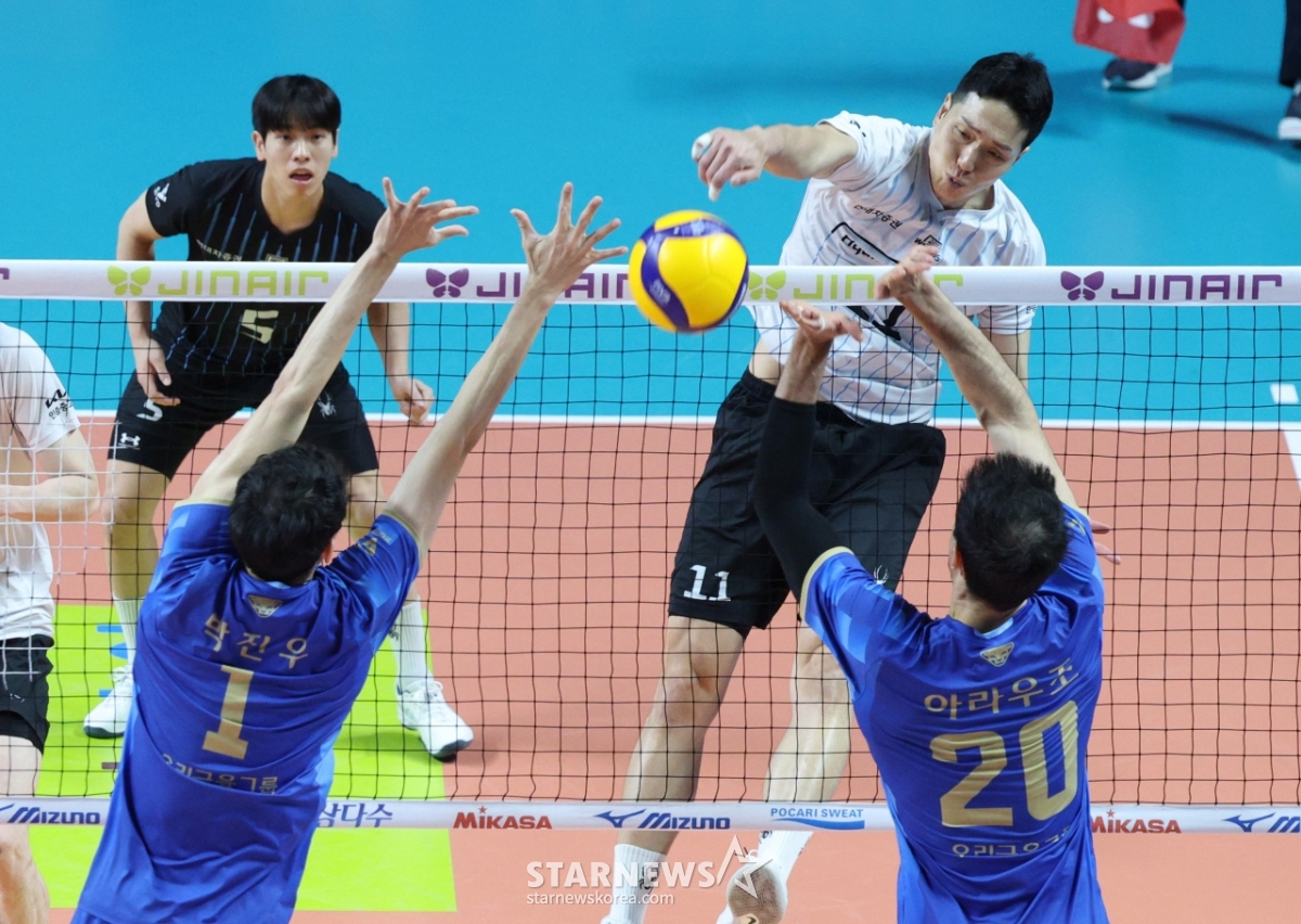 *このコンテンツはAIによって翻訳されました。2025-2026V-リーグ男子部のウリカード対現代キャピタルの試合が6日、ソウル奨忠(チャンチュン)体育館で行われた。現代キャピタルのチェ·ミンホがウリィカードのパク·ジヌ、アラウジョのブロッキングを避けて速攻を試みている。© STARNEWS. 無断転載・再配布禁止*このコンテンツはAIによって翻訳されました。