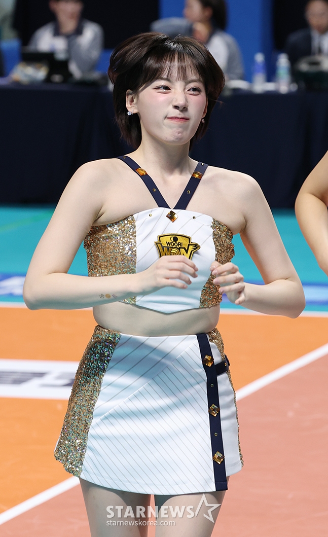 ウリカードのチアリーダー、ハ·ジウォンがさわやかな応援をしている。