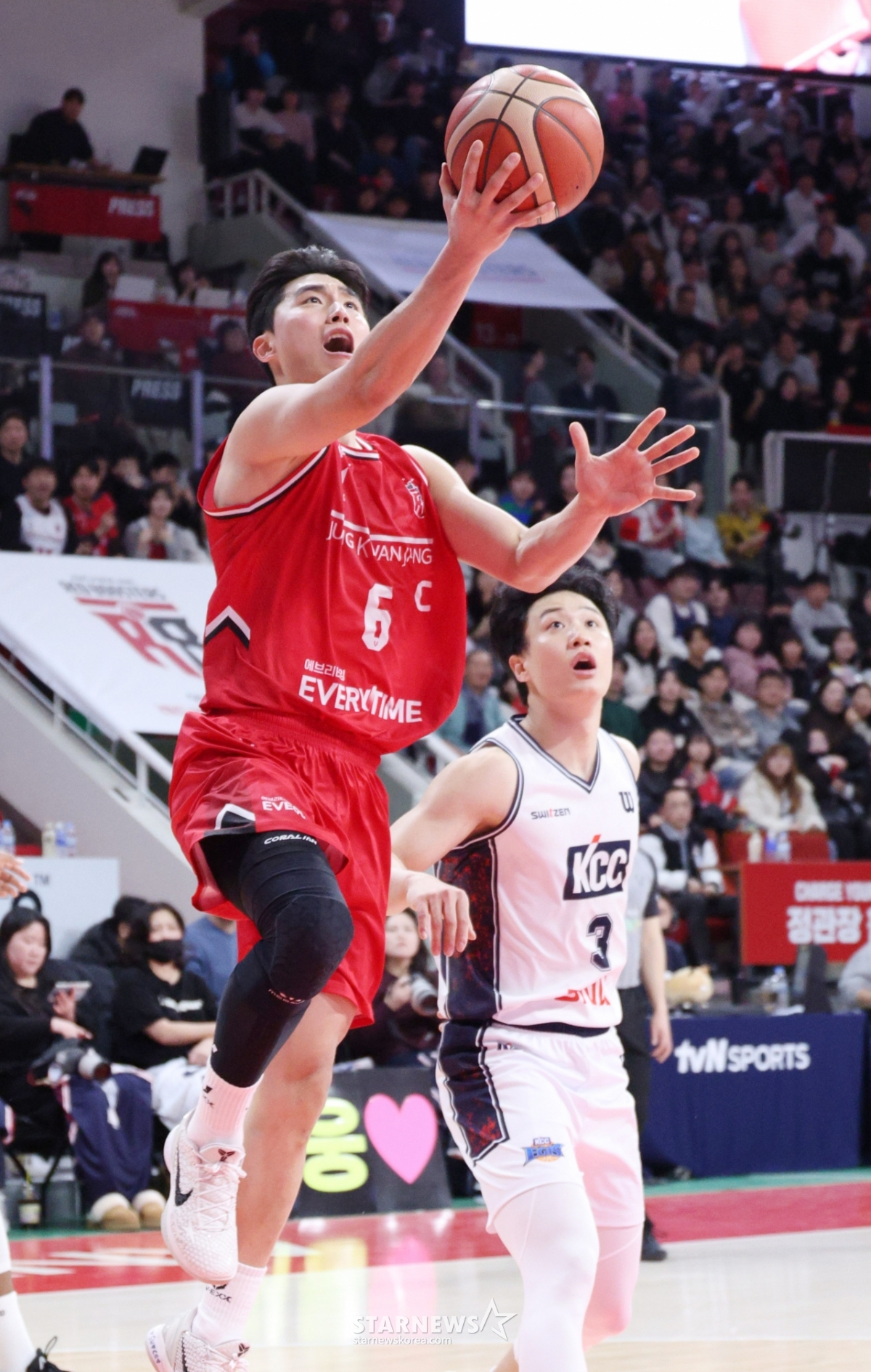 *このコンテンツはAIによって翻訳されました。2025-2026LG電子プロバスケットボール安養正官庄対釜山KCCの試合が7日、京畿道安養正官庄アリーナで行われた。正官庄の朴ジフンがKCCのホ·ウンを抜いてゴール下シュートを打っている。© STARNEWS. 無断転載・再配布禁止*このコンテンツはAIによって翻訳されました。
