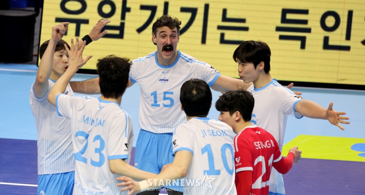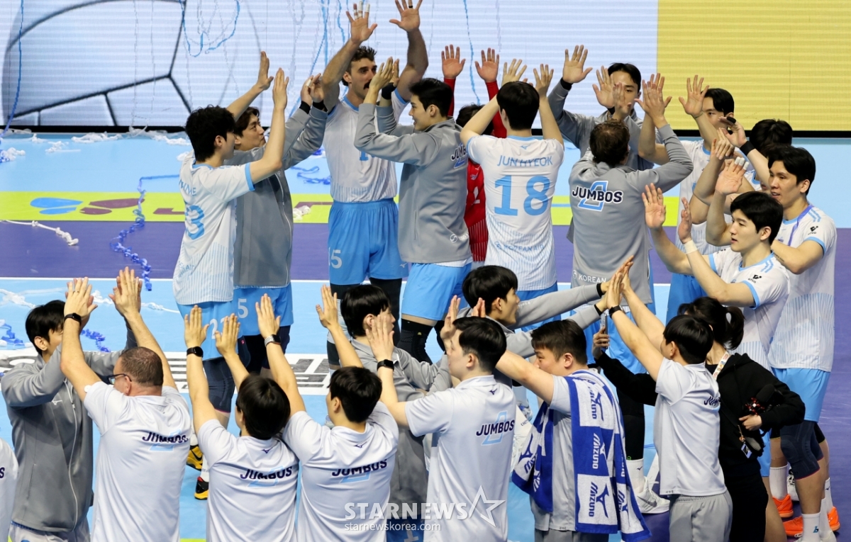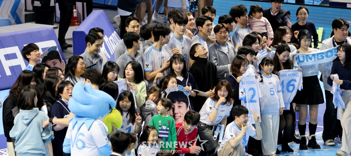 大韓航空のヘナン監督と選手たちが7日、桂陽(ケヤン)体育館で行われた2025-2026ジンエアーVリーグ男子部の大韓航空と韓国電力の試合で3-1で勝利した後、祝っている。 2026.02.07.