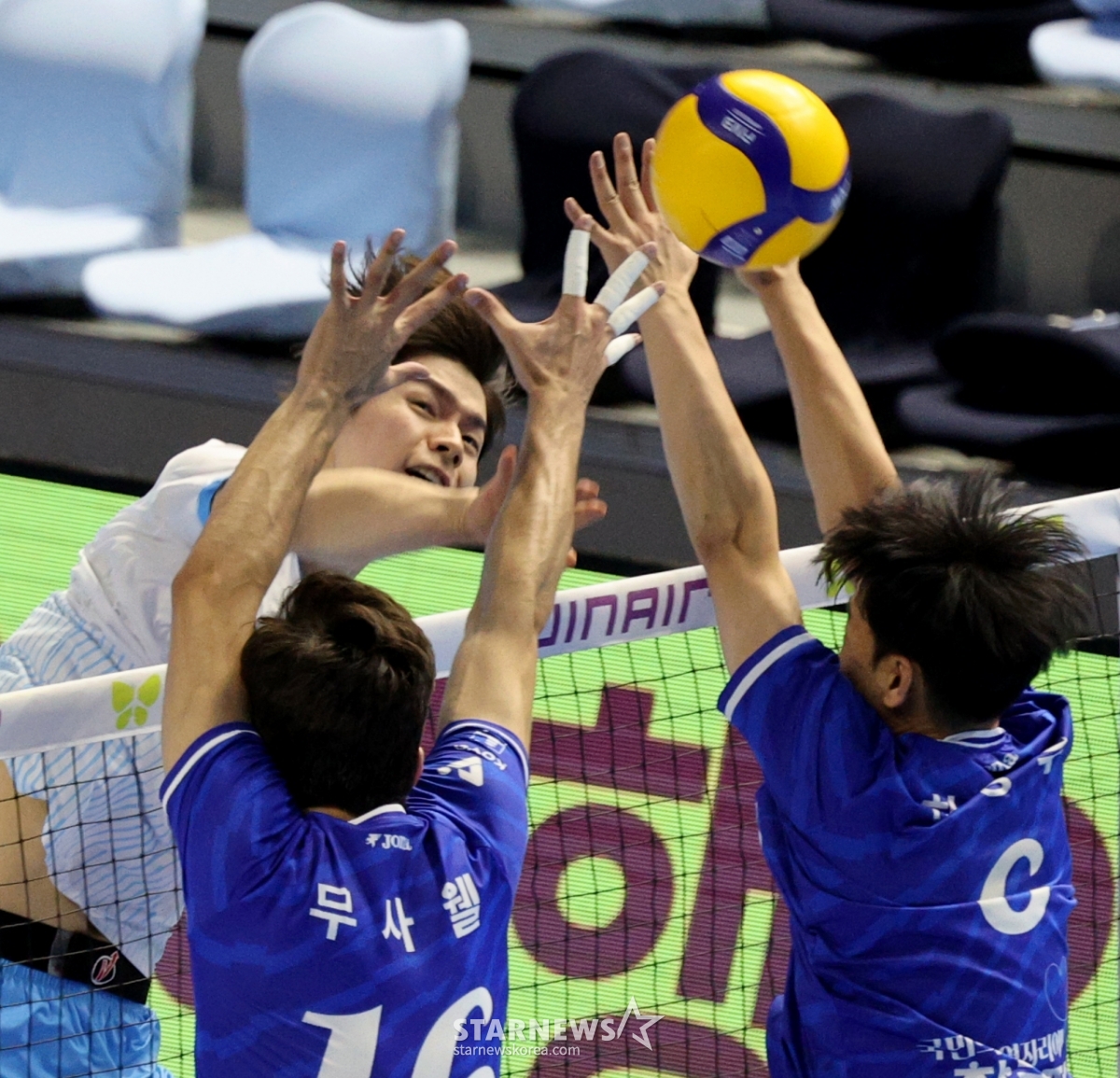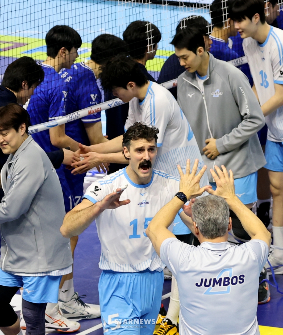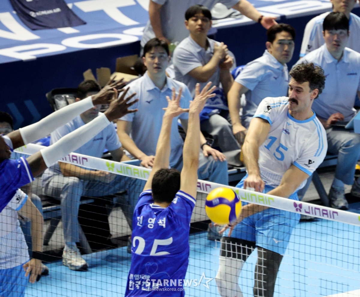 大韓航空のヘナン監督が7日、桂陽(ケヤン)体育館で行われた2025-2026ジンエアーVリーグ男子部の大韓航空と韓国電力の試合で歓呼している。 2026.02.07.