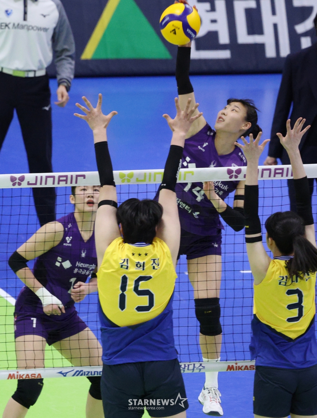 興国生命のチョン·ユンジュが現代建設のキム·ヒジン、キム·ダインのブロッキングの上に強烈なスパイクを飛ばしている。