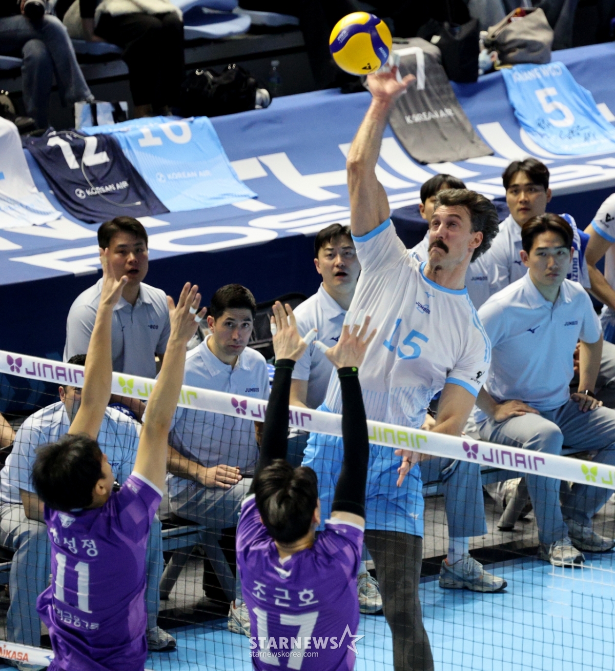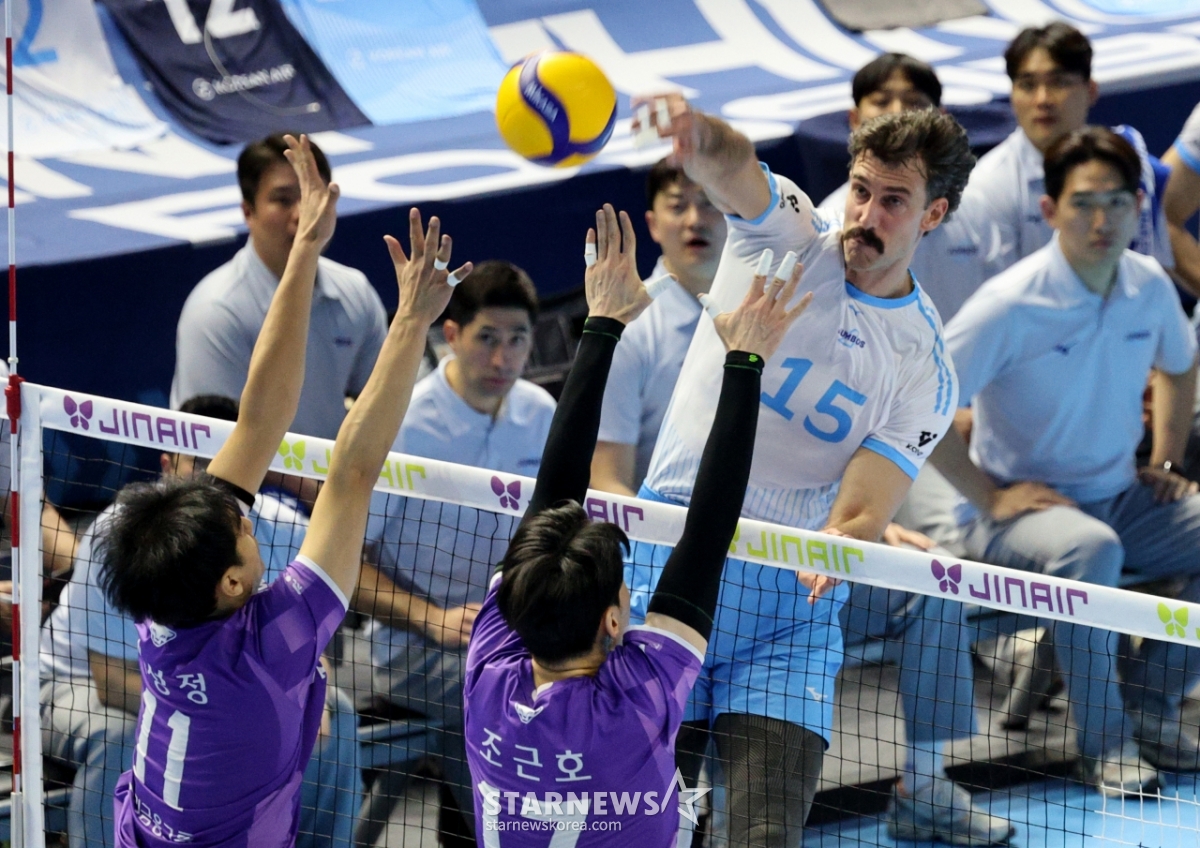大韓航空のラッセルが10日、桂陽体育館で開かれたジンエアー2025-2026Vリーグの大韓航空とウリィカードの試合で、韓国の二重ブロッキングを圧倒する高空強打を放っている。 2026.02.10.