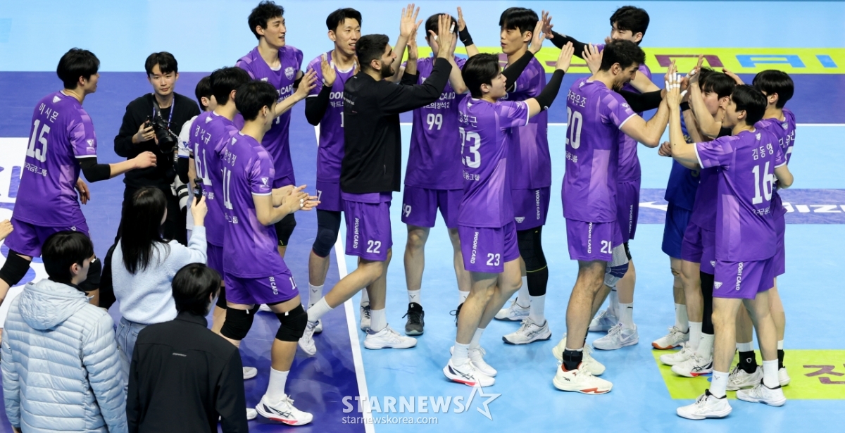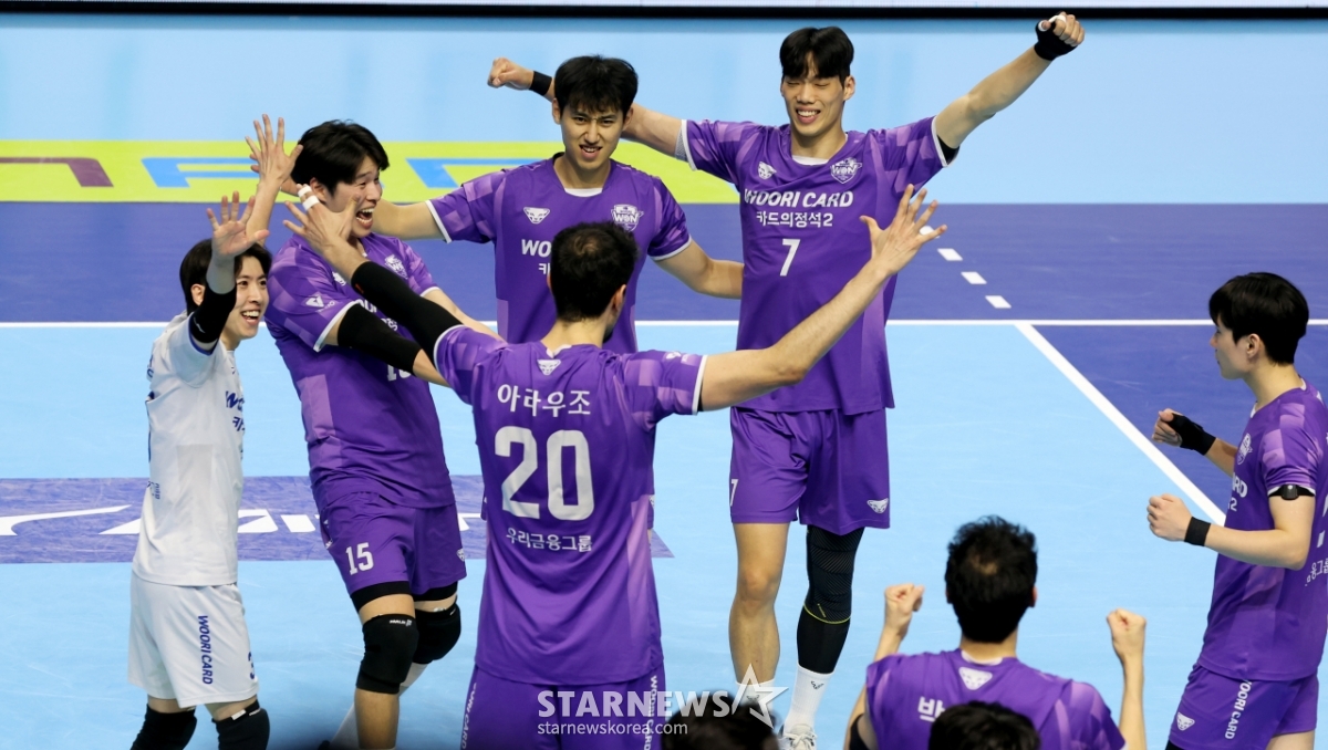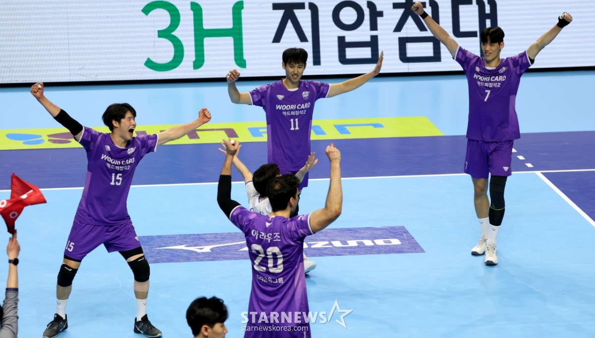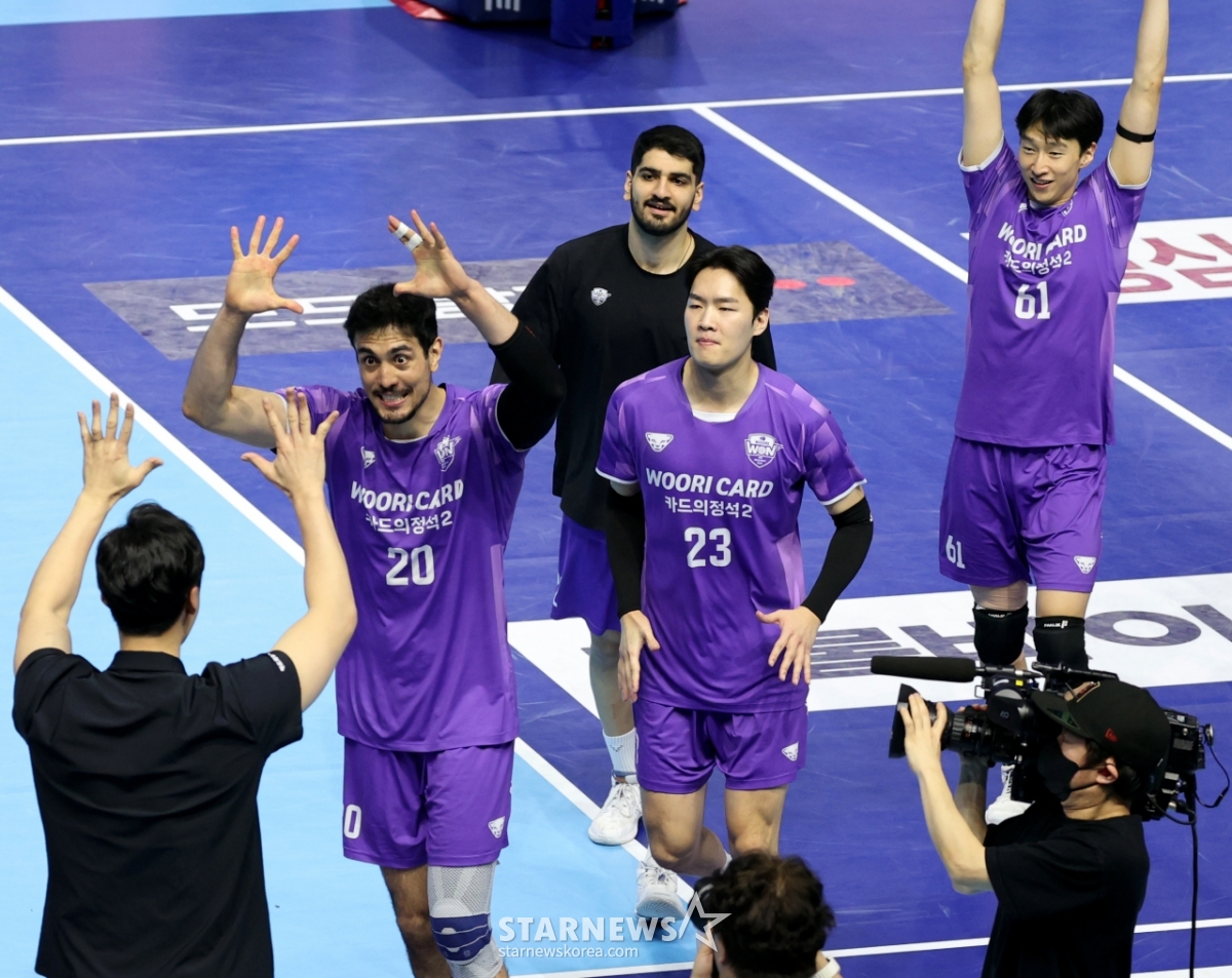 ウリカードの選手たちが10日、桂陽体育館で行われたジンエアー2025-2026Vリーグの大韓航空とウリカードの試合で、セットスコア3-1で勝利した後、歓呼している。 2026.02.10.