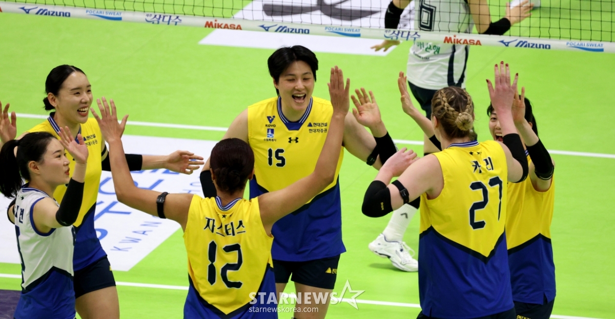 現代(ヒョンデ)建設の金ヒジンと選手たちが13日、水原(スウォン)体育館で行われた「2025-2026ジンエアーVリーグ」の現代建設と韓国道路公社の試合で得点した後、歓呼している.. 2026.02.13.
