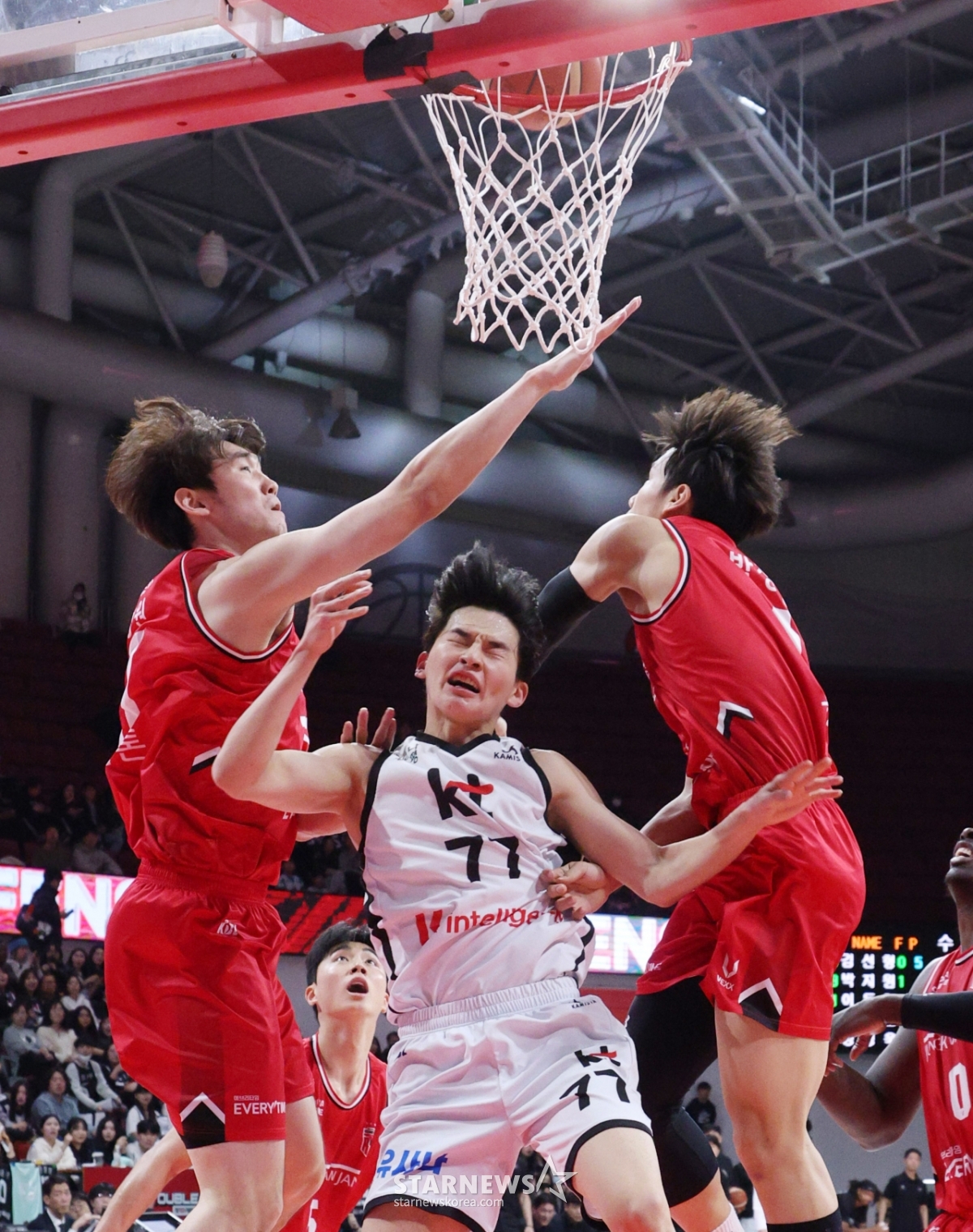 KTのカン·ソンウクが正官長のキム·ギョンウォンとパク·ジョンウンを抜いてゴール下シュートを試みている。